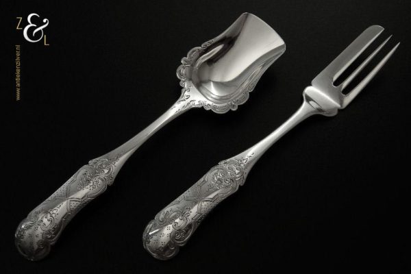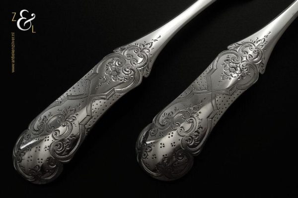 Gembercouvert gemaakt in Amsterdam door W.F. Schuss (meesterteken anker boven WS in vierkant) in het jaar 1868 (jaarletter I). Dit in Biedermeier uitgevoerde zilveren gembercouvert is gegraveerd met c-vormige voluten, stippel- en bloemmotieven. Tevens zijn de lepel en vork aan de achterzijde gegraveerd met een cartouche. Het gembercouvert weegt 66 gram en is 17.5 cm lang.