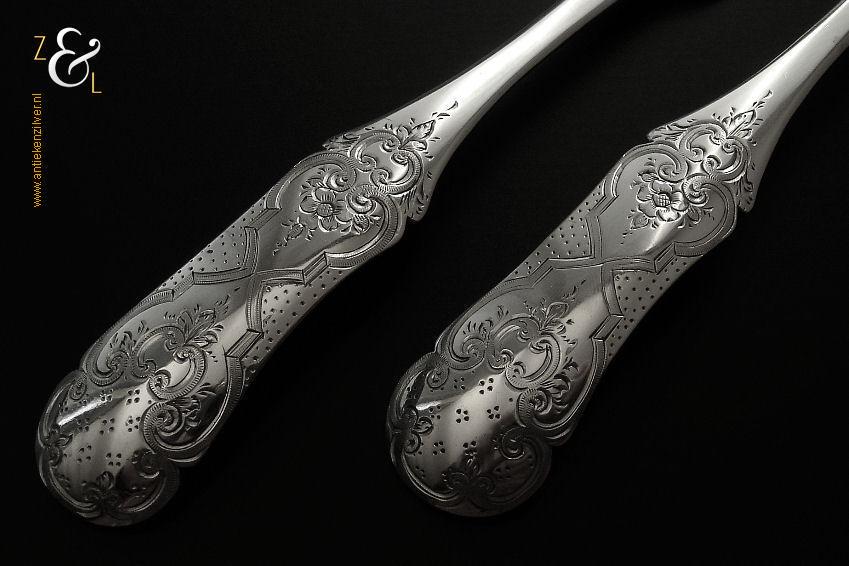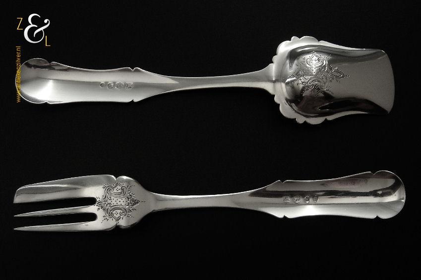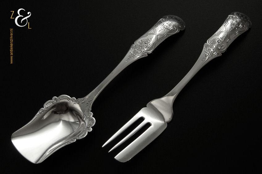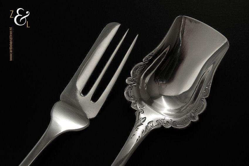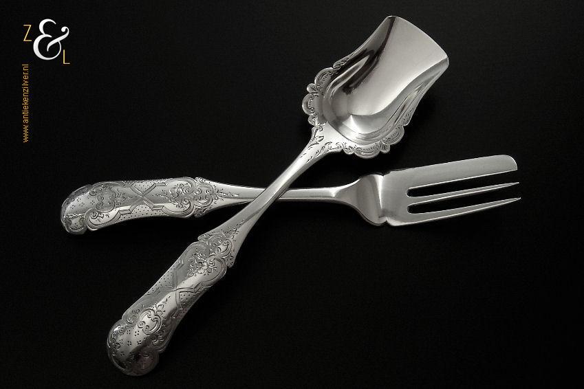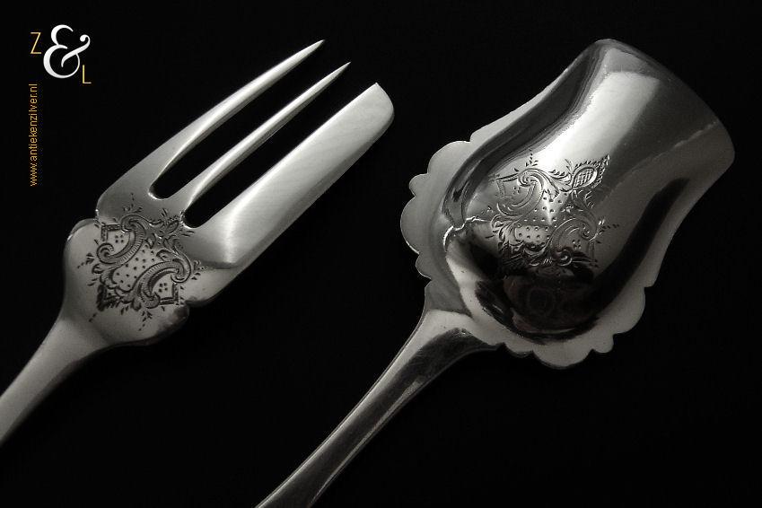 Gembercouvert gemaakt in Amsterdam door W.F. Schuss (meesterteken anker boven WS in vierkant) in het jaar 1868 (jaarletter I). Dit in Biedermeier uitgevoerde zilveren gembercouvert is gegraveerd met c-vormige voluten, stippel- en bloemmotieven. Tevens zijn de lepel en vork aan de achterzijde gegraveerd met een cartouche. Het gembercouvert weegt 66 gram en is 17.5 cm lang.