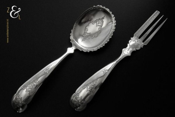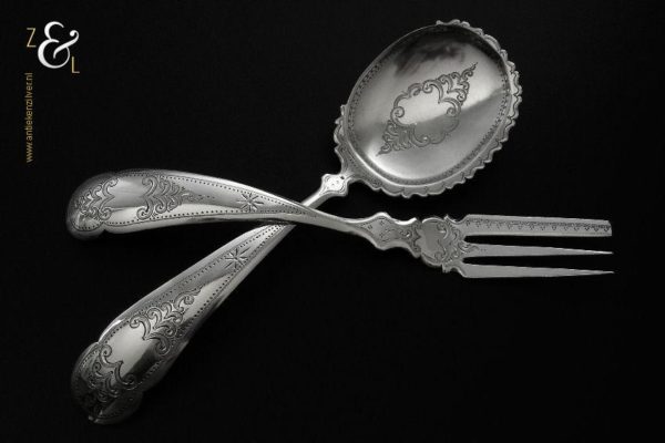 Gembercouvert gemaakt in Schoonhoven door Jacob Kooiman (meesterteken JK. boven 1 in vierkant) in het jaar 1885 (jaarletter A). Dit zilveren Jugendstil gembercouvert is geheel gegraveerd en heeft een cartouche in de met accoladerand uitgevoerde lepelbak. Het gembercouvert weegt 53 gram en is 17.9 cm lang. De lepelbak is 7 cm lang bij 5.1 cm breed.
