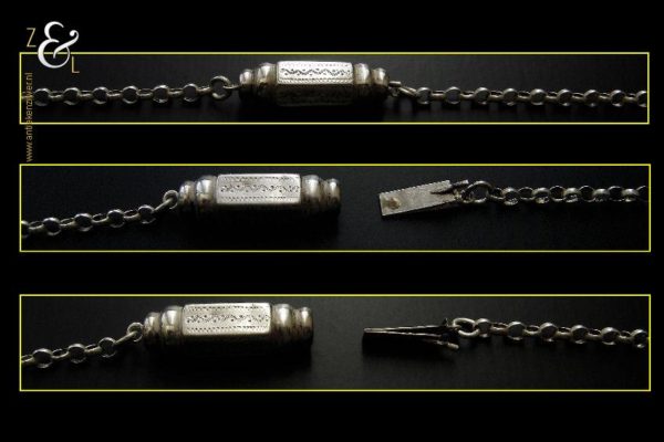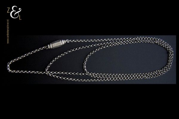 Deze antieke dames horloge- chatelaine- signetten- sautoirketting met jasseronschakel weegt 24 gram is 152 cm lang en heeft een zeskantig slot van 3.3 cm. De niet gekeurde zilveren ketting is op zilver getoetst. De ketting werd door dames om de hals gedragen en aan de ketting werd een hanghorloge en/of signet bevestigd. Het horloge en/of signet werden onder de rokband in een klein zakje opgeborgen.