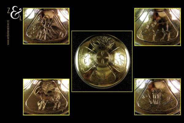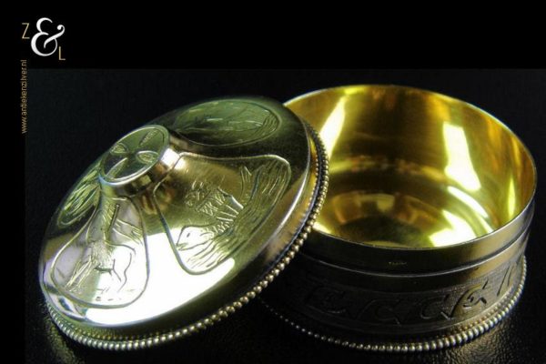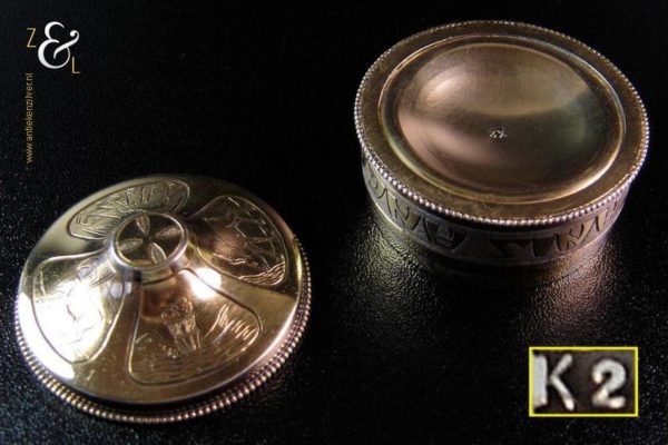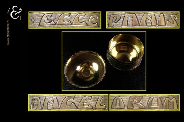 Hostiedoosje of pyxis gemaakt in Utrecht door H.F.J. Kaub (meesterteken K2 in rechthoek) tussen 1918 en 1930. Dit geheel vergulde zilveren hostiedoosje heeft een gegraveerde deksel met de symbolische taferelen van het Lam Gods, een vis die een mand met drie broden op zijn rug draagt, een hert bij het stromend water en een pelikaan met jongen. Op de zijkant van het doosje staat de tekst ECCE PANIS ANGELORUM wat HET BROOD DER ENGELEN betekent. Het hostiedoosje weegt 39 gram is 2.5 cm hoog en heeft een diameter van 4.3 cm.