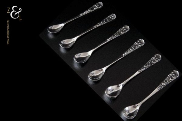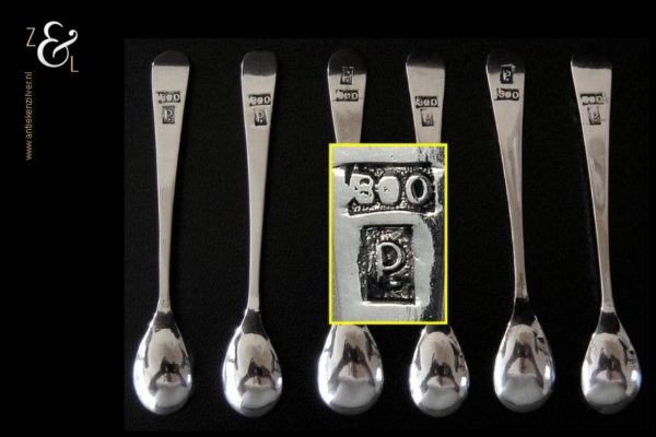 Deze 6 Djokja / Yogyakarta espressolepels / mokkalepels zijn verkocht door: Magasin L’art Tjikini No. 71 Telf. No. 2343 naast de dierentuin Djakarta. De lepels zijn gestempeld met het (meesterteken P. in rechthoek) deze zilversmid is bij ons onbekend, en zijn tevens gestempeld met het (zilverkeur 800 in rechthoek) dat aangeeft dat het gehalte zilver bij deze lepels 800/000 is. De stevige zilveren lepels zijn 9 cm lang en wegen samen 39 gram. Het kartonnen doosje is in zéér slechte staat en hebben we met tape moeten restaureren, maar we vonden het zo leuk dat het nog bestond dat we hebben besloten het erbij te doen. Het doosje is 14.5 cm lang bij10.6 cm breed bij 3.8 cm hoog.