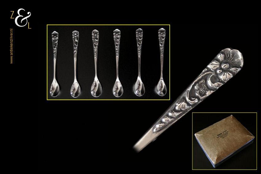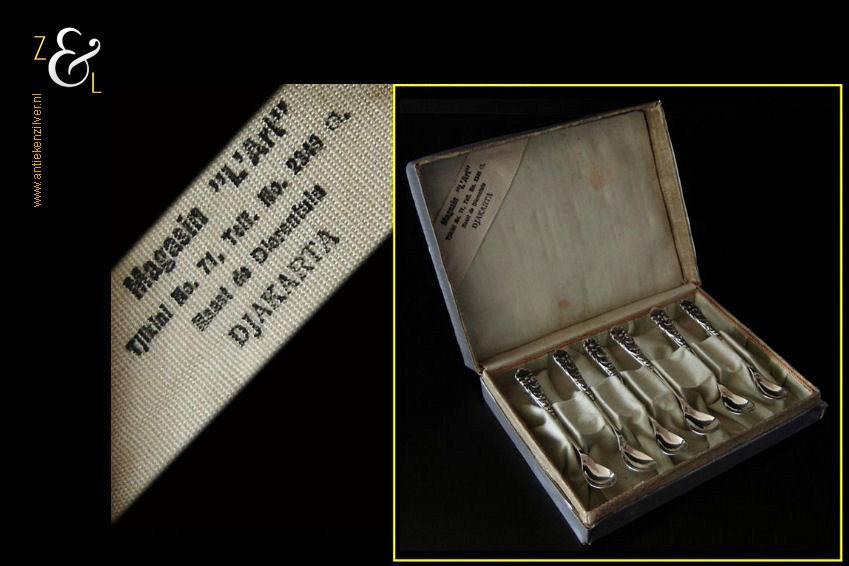 Deze 6 Djokja / Yogyakarta espressolepels / mokkalepels zijn verkocht door: Magasin L’art Tjikini No. 71 Telf. No. 2343 naast de dierentuin Djakarta. De lepels zijn gestempeld met het (meesterteken P. in rechthoek) deze zilversmid is bij ons onbekend, en zijn tevens gestempeld met het (zilverkeur 800 in rechthoek) dat aangeeft dat het gehalte zilver bij deze lepels 800/000 is. De stevige zilveren lepels zijn 9 cm lang en wegen samen 39 gram. Het kartonnen doosje is in zéér slechte staat en hebben we met tape moeten restaureren, maar we vonden het zo leuk dat het nog bestond dat we hebben besloten het erbij te doen. Het doosje is 14.5 cm lang bij 10.6 cm breed bij 3.8 cm hoog.