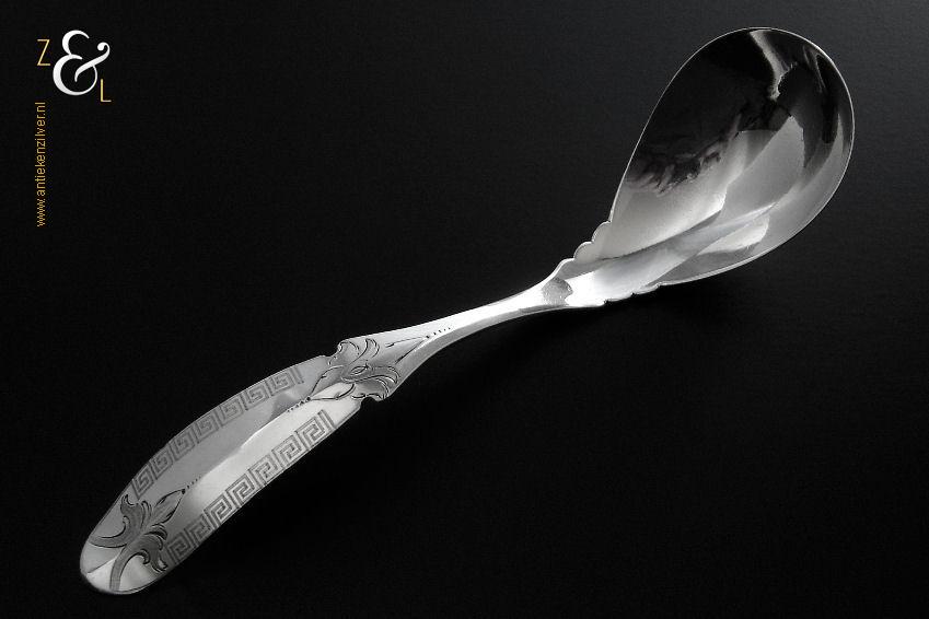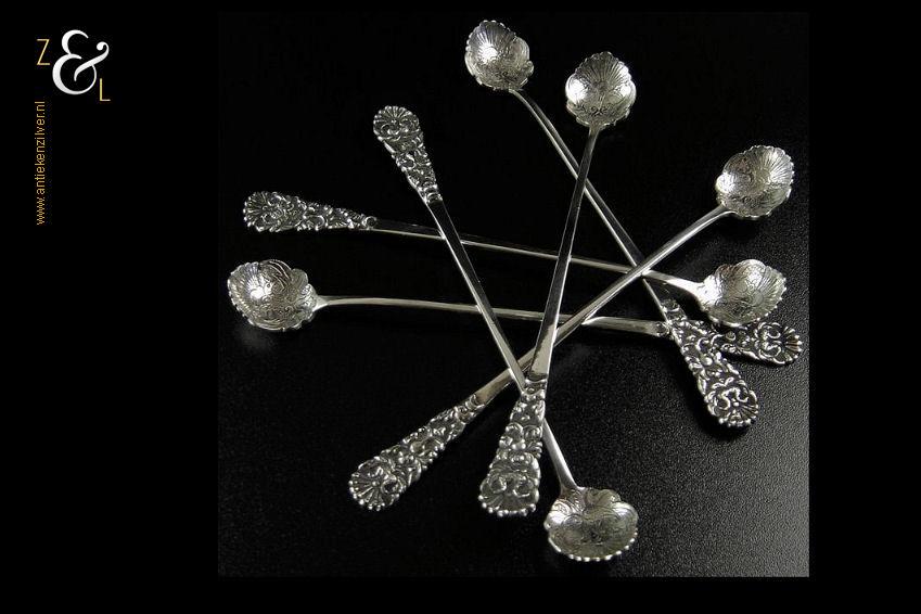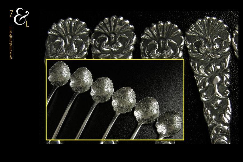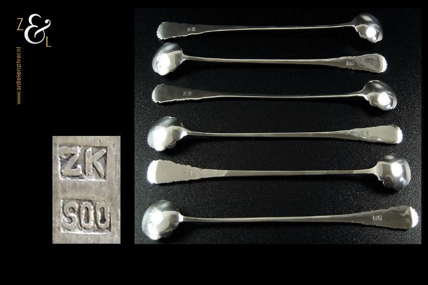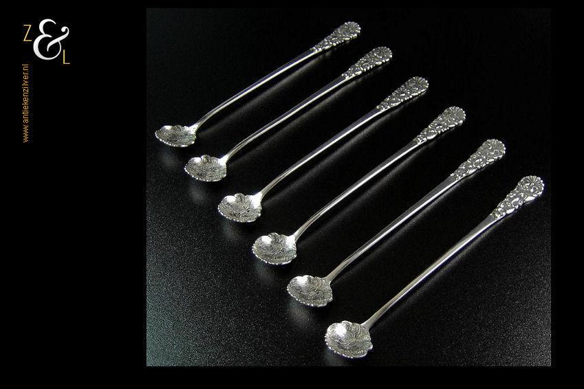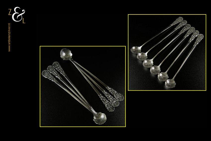 Deze 6 Djokja / Yogyakarta longdrinklepels zijn gemaakt in Djakarta Indonesië. De lepels zijn gestempeld met het atelier of meesterteken ZK in een rechthoek, deze zilversmid of zilversmederij is bij ons nog onbekend. Zowel de steel als de bak van deze lepels zijn voorzien van een pauwmotief ze zijn 16.5 cm lang en wegen 107 gram. Tevens zijn de longdrinklepels gestempeld met het zilverkeur 800 in een rechthoek dat aangeeft dat het gehalte zilver bij deze lepels 800/000 is, dit noemen wij in Nederland ook wel derde gehalte zilver. De zilveren longdrinklepels zijn ook goed te gebruiken als koffie- of theelepel in een mok of als Cocktail-, Sorbet- of IJslepel.