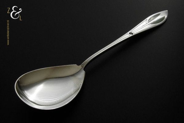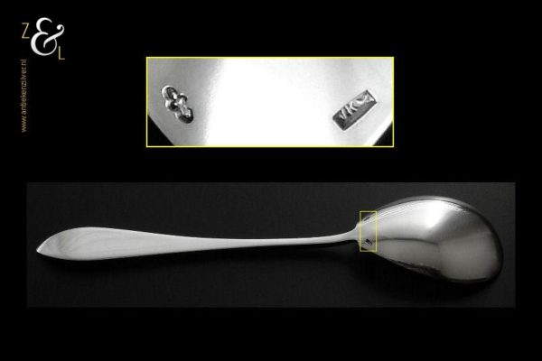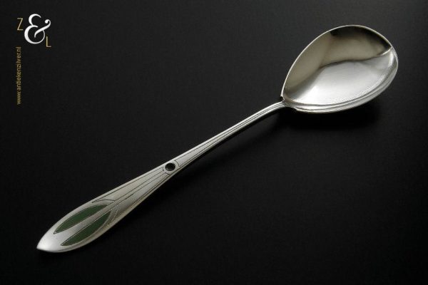 Deze groen en zwart geëmailleerde jamlepel / confiturenlepel is gemaakt in Voorschoten door de Firma J.M. van Kempen & Zonen (meesterteken VK liggend maantje in rechthoek) tussen 1858 en 1905 (gekeurd met het zilverkeur zwaardje). De zilveren Art Deco jamlepel / confiturenlepel weegt 28 gram en is 15.3 cm lang. De lepelbak is 4.9 cm lang bij 3.6 cm breed.