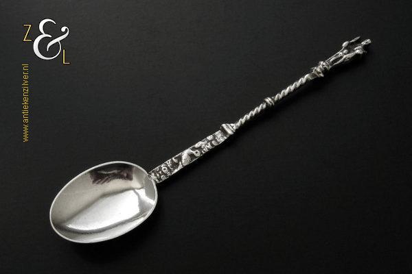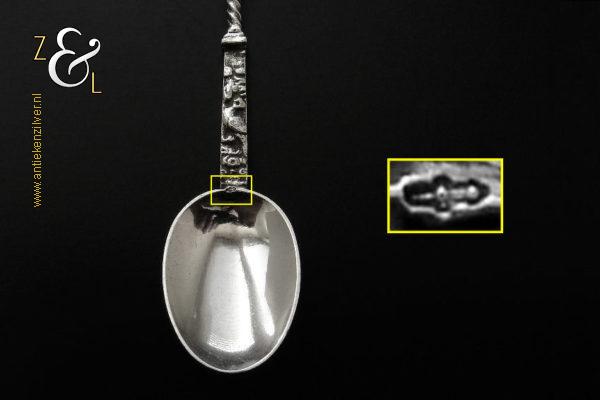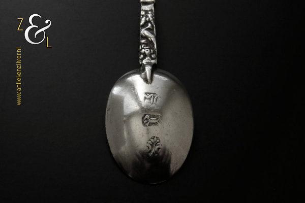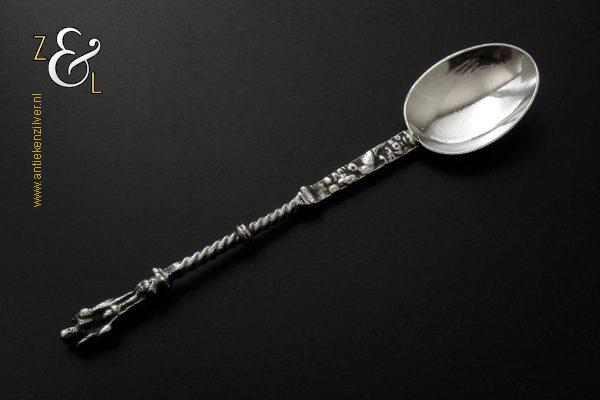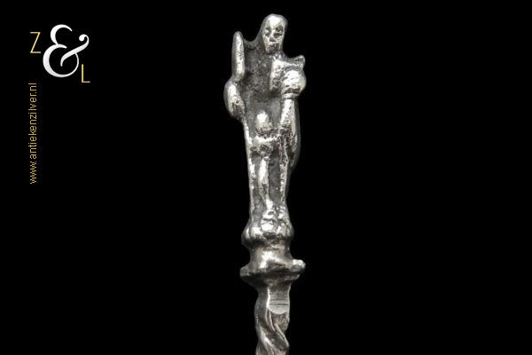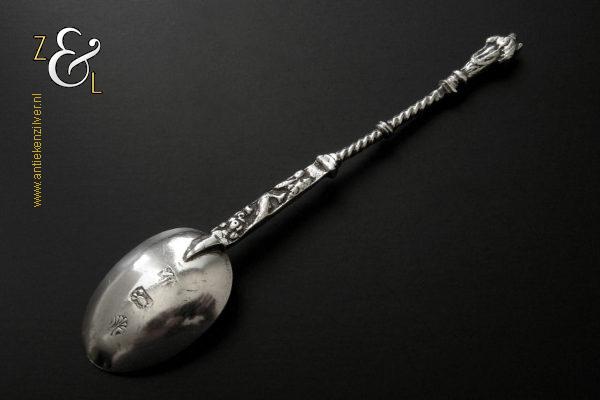 Deze koffielepel / theelepel is in de 19e eeuw gemaakt in Nederland en is gekeurd met het zilverkeur zwaardje (dit is het gehaltemerk voor kleine zilveren werken) dat tussen 1814 en 1905 in gebruik was. De zilveren Neostijl koffielepel / theelepel die gemaakt is naar een model uit de 18e eeuw heeft een getordeerde steel die bekroond is met een herder of apostel en een lepelbak die aan de achterzijde drie fantasiekeuren draagt. De koffielepel / theelepel weegt 18 gram en is 13.3 cm lang.