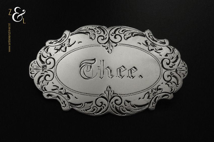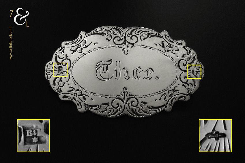 Dit in Biedermeier stijl uitgevoerde label / etiket is gemaakt in Rotterdam door Willem Baksteen & Cornelis Johannes Middendorp (meesterteken B&M boven ster in rechthoek) tussen 1861 en 1889 gekeurd met het zilverkeur zwaardje (dit is het gehaltemerk voor kleine zilveren werken). Het zilveren op de hand gedreven (aan de achterzijde is het gehamerd oppervlak zichtbaar) label / etiket is fijntjes gegraveerd met c-vormige voluten en heeft in gotisch lettertype het opschrift “Thee”. Aan de achterzijde zit een stukje draadeind gesoldeerd zodat men gebruikmakend van het boutje en ringetje het label / etiket op een theekistje of theedoosje kan monteren. Het label / etiket weegt 10 gram en is 6.5 cm lang bij 3.9 cm breed.