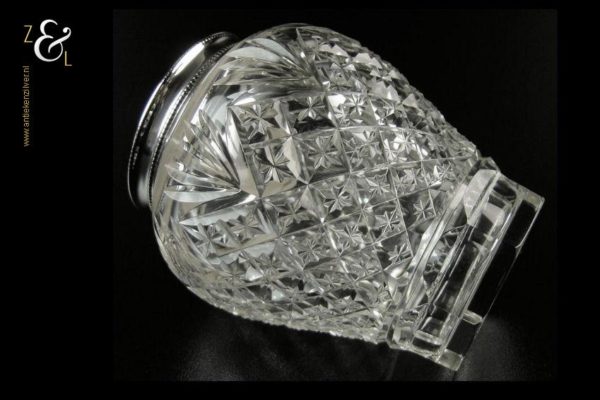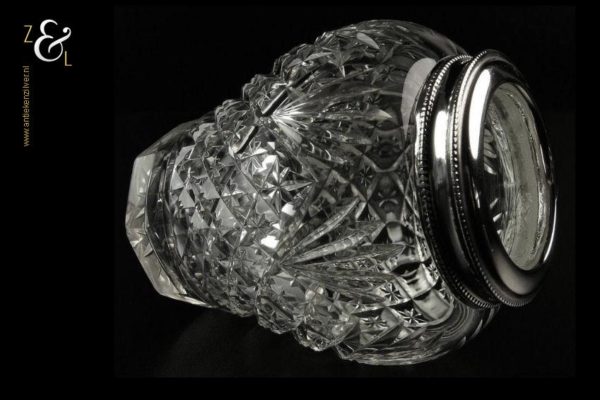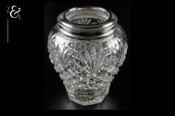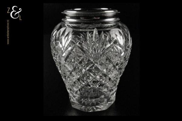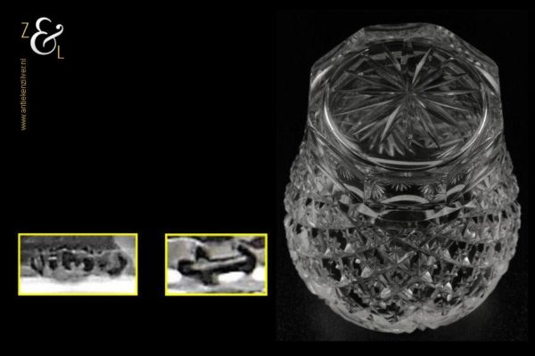 Dit lepelvaasje met zilveren montuur is mondgeblazen en in ruit en waaier handgeslepen en gepolijst. Het zilveren montuur met parelrand is gemaakt in Amsterdam door H.L. van Emden (meesterteken .HvE. In zeshoek) tussen de jaren 1891 en 1904. Het lepelvaasje is 8.6 cm hoog heeft een diameter van 7 cm en weegt 143 gram.