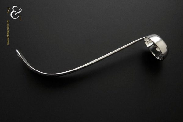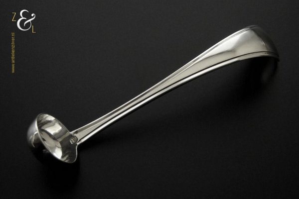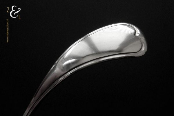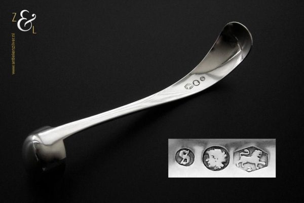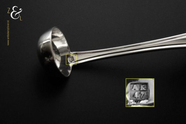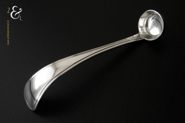 Mosterdlepel gemaakt in Schoonhoven door Adrianus Kuijlenburg Pz. (meesterteken AK boven 47 in vierkant) in het jaar 1877 (jaarletter S). Deze zilveren Neostijl mosterdlepel model hartfilet heeft een apart gevormde diepe bak. De mosterdlepel weegt 11 gram en is 9.8 cm lang. De bak heeft een diameter van 1.8 cm.