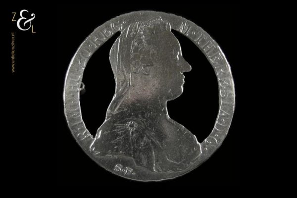 Deze zilveren muntbroche is gemaakt van een Maria Theresia Thaler dit is een Oostenrijkse munt die in het Habsburgse Rijk geslagen werd en ter nagedachtenis aan het sterftejaar van de Habsburgse keizerin al eeuwenlang het jaartal 1780 draagt.