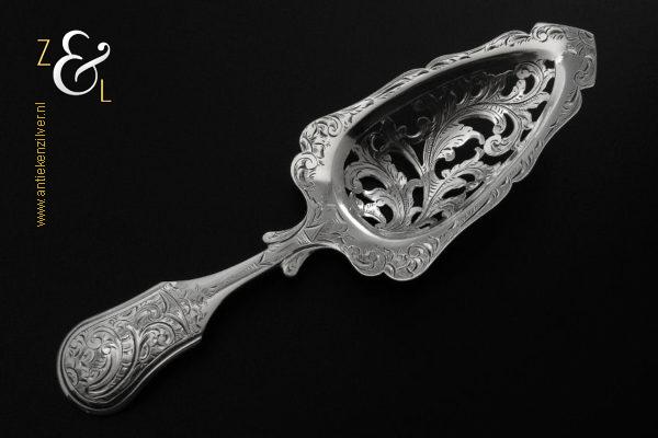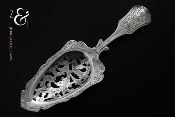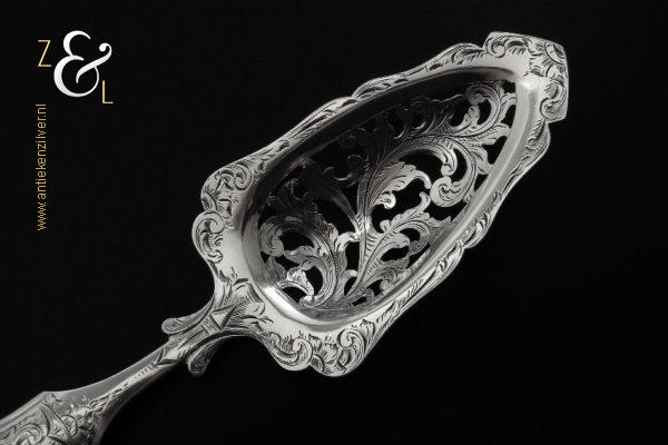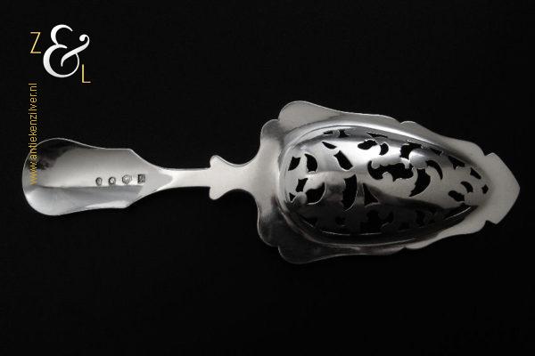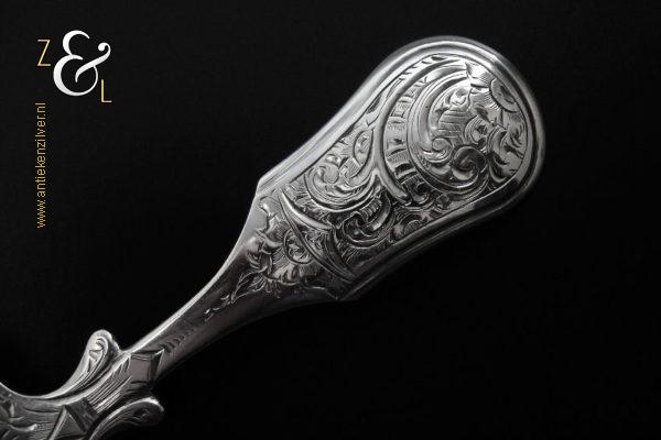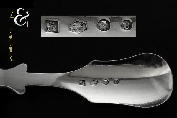 Natfruitlepel gemaakt in Amsterdam door Jan Hendrik Eversbag (meesterteken anker boven I E in vierkant) in het jaar 1854 (jaarletter U). Het jaarletter op deze natfruitlepel heeft een stip, dit geeft aan dat de keurmeester tijdens dit jaar werd opgevolgd of overleden was.* De zilveren Biedermeier natfruitlepel heeft een uitgezaagd schepgedeelte en is diep gegraveerd met c-vormige voluten en bladmotieven. De natfruitlepel weegt 41 gram en is 18.6 cm lang. De lepelbak is 10 cm lang bij 5.8 cm breed.