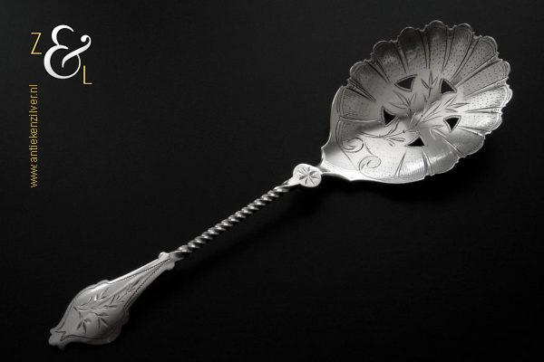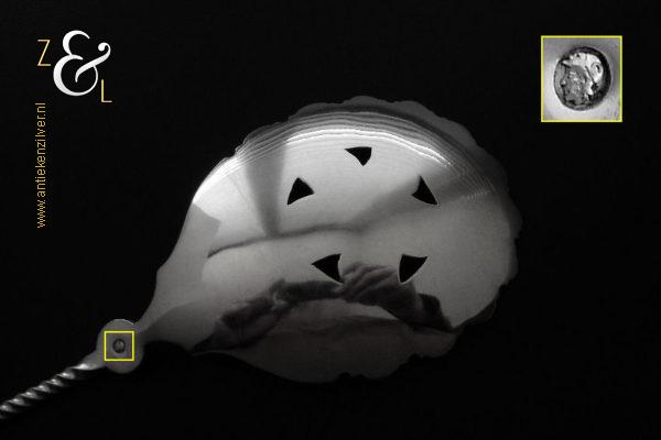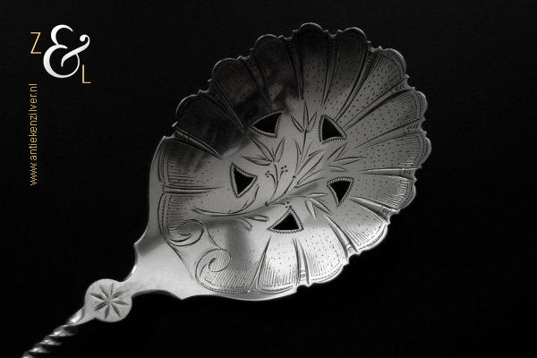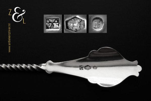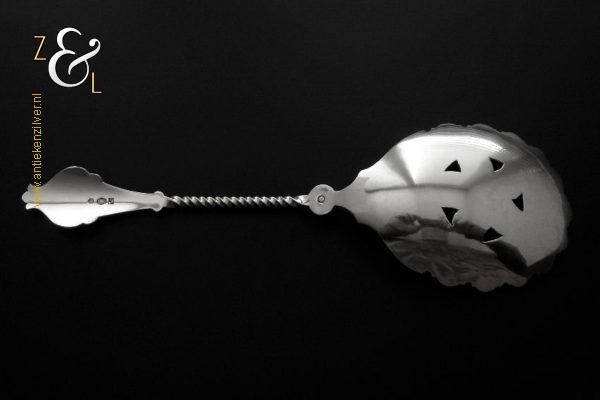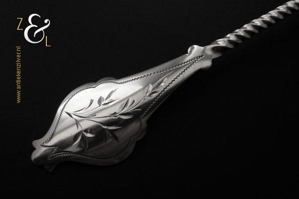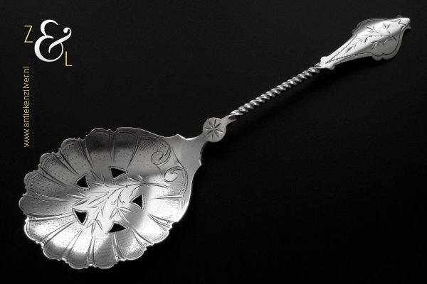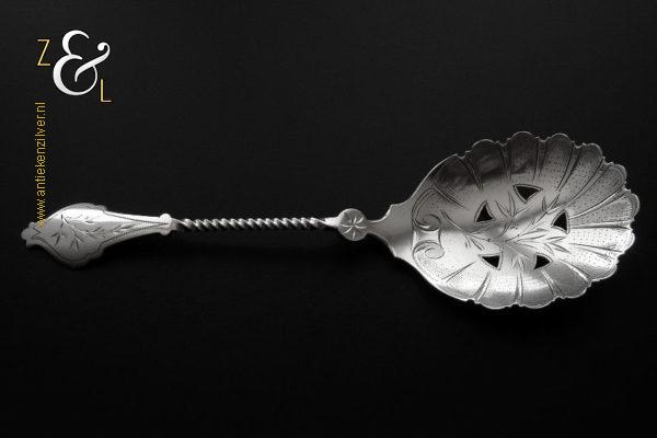 Deze natfruitlepel is gemaakt in Voorschoten bij de Firma J.M. van Kempen & Zonen (meesterteken liggend maantje tussen punten boven VK in vierkant) in het jaar 1890 (jaarletter F). De zilveren Neostijl natfruitlepel die een getordeerde steel heeft is uitgevoerd met een uitgezaagd handvat dat gegraveerd is met een bladmotief. De lepelbak is fijntjes gegraveerd met een bladmotief en is uitgezaagd en licht gematteerd (matteren is een bewerking waarbij de zilversmid het oppervlak van een zilveren voorwerp een matte structuur geeft). De natfruitlepel weegt 70 gram en is 22.1 cm lang. De lepelbak is 8.8 cm lang bij 6.7 cm breed.