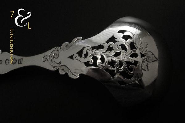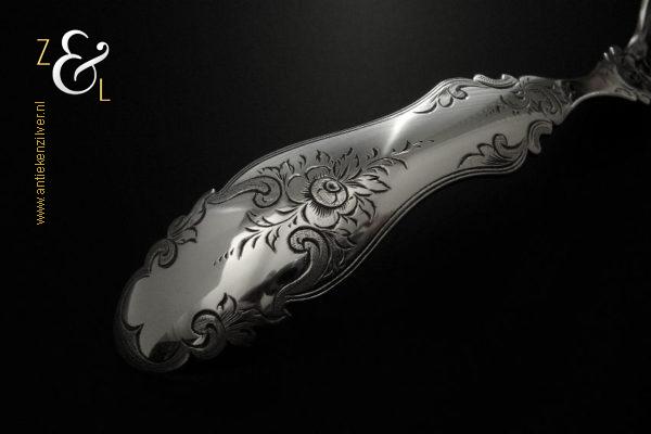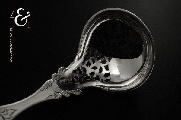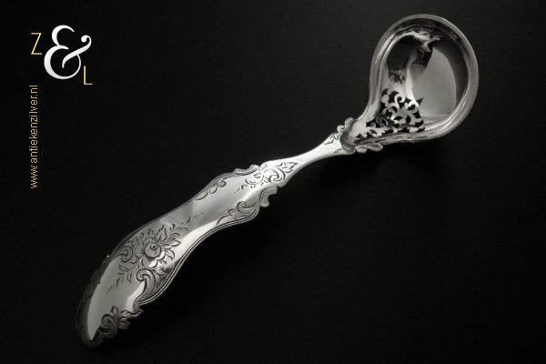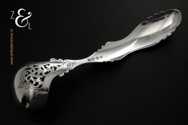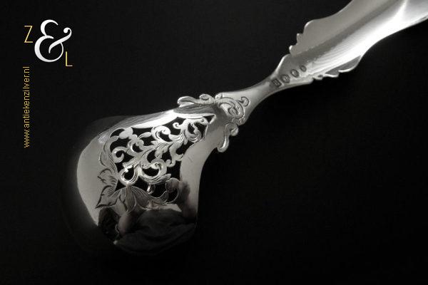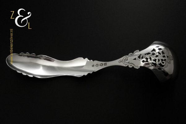 Deze natfruitlepel is gemaakt in Amsterdam door Jacob van Wijk jr. (meesterteken JvW onder vis in vierkant) in het jaar 1861 (jaarletter B). De zilveren Neostijl natfruitlepel heeft een ronde met c-vormige voluten uitgezaagde lepelbak en een met bloem- en bladmotieven gegraveerde steel en handvat. De natfruitlepel weegt 40 gram en is 18.2 cm lang. De lepelbak heeft een diameter van 4.7 cm.