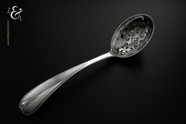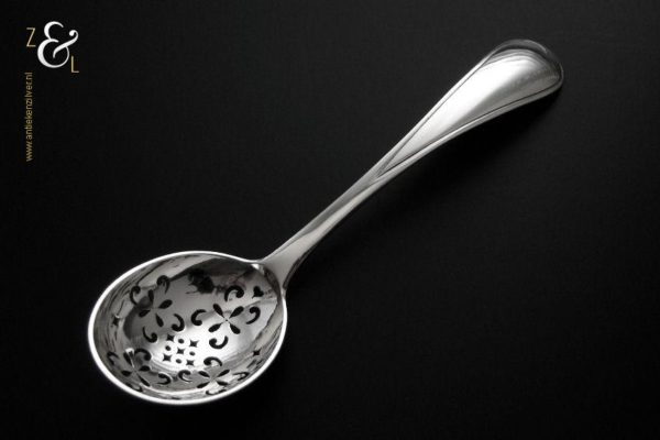 Natfruitlepel / suikerstrooilepel gemaakt in Amsterdam door H.A. Schuss (meesterteken HAS onder anker in vierkant) in het jaar 1856 (jaarletter W). Deze zilveren Biedermeier natfruitlepel / suikerstrooilepel is uitgevoerd in model hartfilet en heeft een fraai uitgezaagde lepelbak met harten, ruiten en gestileerde bloemmotieven. De natfruitlepel / suikerstrooilepel weegt 37 gram is 17.6 cm lang en heeft een bak van 6 cm bij 4.2 cm.