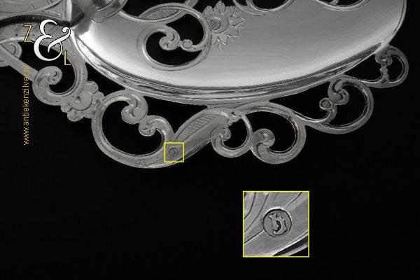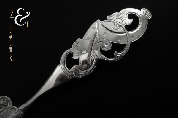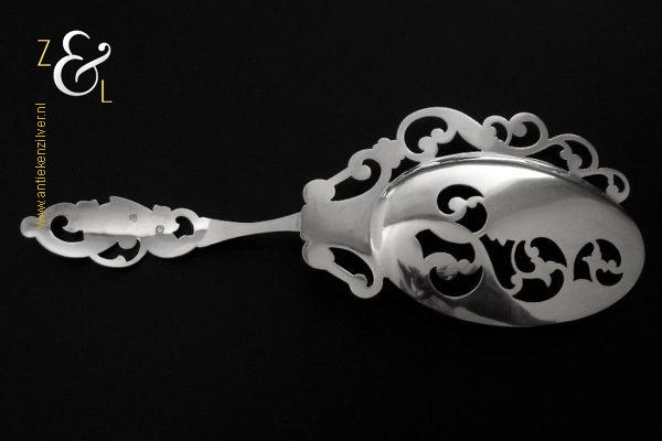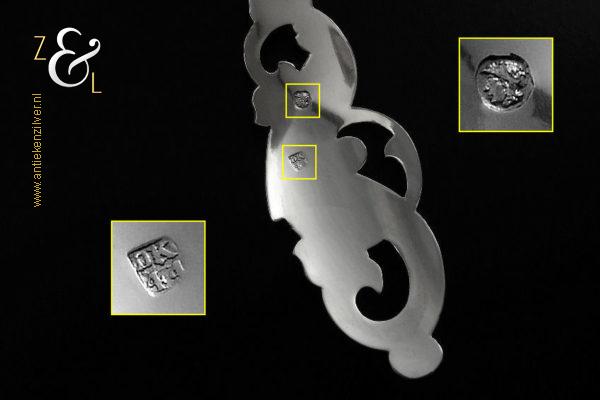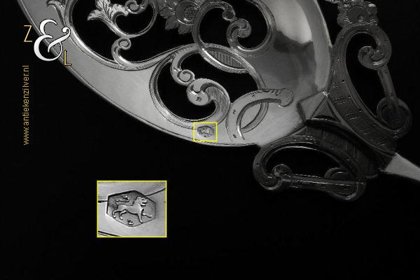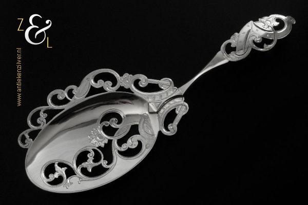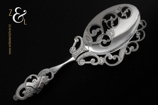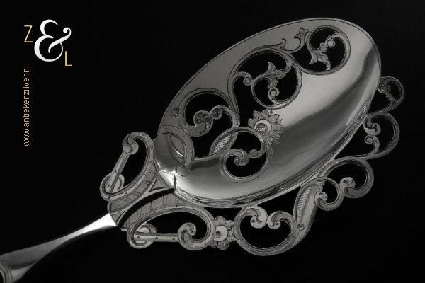 Deze natfruitschep / pasteischep is gemaakt in Den Bosch / ‘s-Hertogenbosch door Antonius Hendrikus der Kinderen (meesterteken DK boven 44 in vierkant) in het jaar 1867 (jaarletter H). De zilveren Neostijl natfruitschep / pasteischep heeft een sierlijk uitgezaagd schepgedeelte en handvat die gegraveerd zijn met c-vormige voluten. De natfruitschep / pasteischep weegt 42 gram en is 20.5 cm lang. Het schepgedeelte is 11.1 cm lang bij 7.3 cm breed.