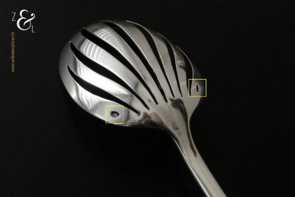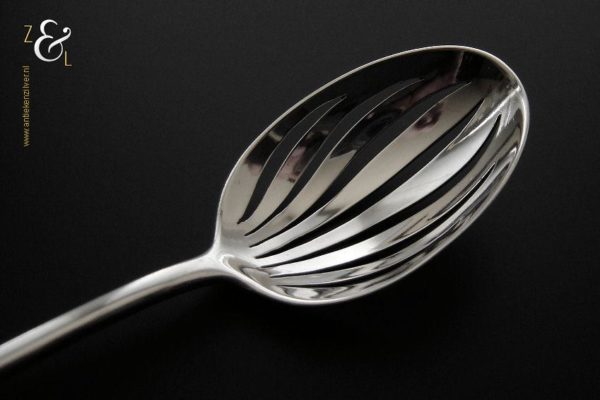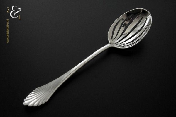 Olijflepel gemaakt in Zeist door Gerritsen & van Kempen N.V. (meesterteken V.K. in G) tussen 1926 en 1953 (gekeurd met het zilverkeur zwaardje). Deze in waaier / palmet uitgevoerde zilveren Art Deco olijflepel weegt 26 gram en is 14.3 cm lang. De bak is 4.9 cm lang bij 3.2 cm breed.