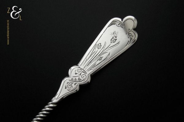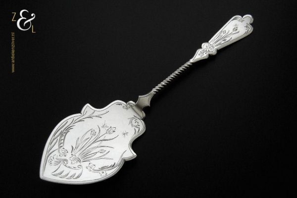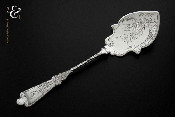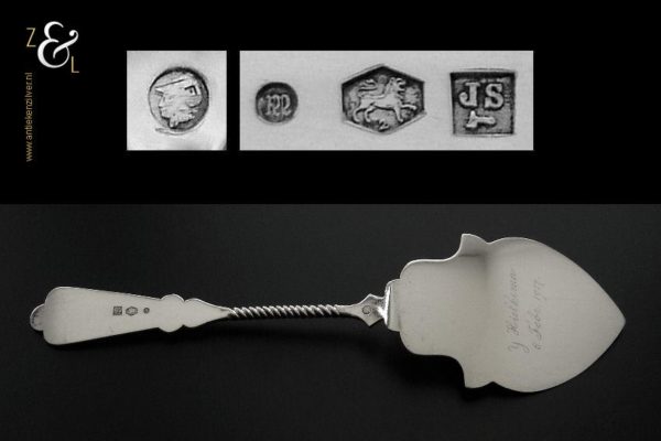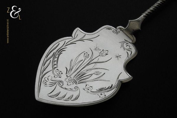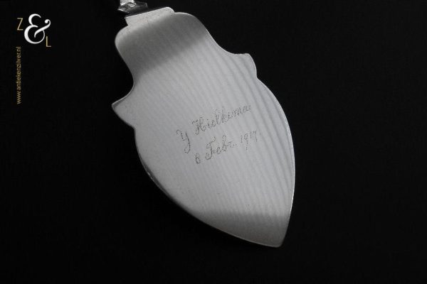 Petitfourschep / taartschep gemaakt in Sneek Friesland door Johannes Henricus Schijfsma (meesterteken JS boven hamer in vierkant) in het jaar 1906 (jaarletter W). De zilveren petitfourschep / taartschep heeft een getordeerde steel en zowel de schep als handvat is sierlijk gegraveerd met tulpen en insecten. De achterzijde van de schep heeft een gravering met “Y. Hielkema 8 Febr. 1917”. De petitfourschep / taartschep weegt 48 gram en is 20.1 cm lang. Het schepgedeelte is 8.2 cm lang bij 5.2 cm breed.