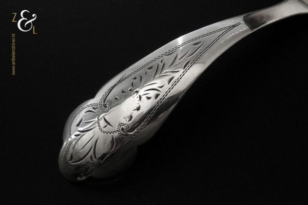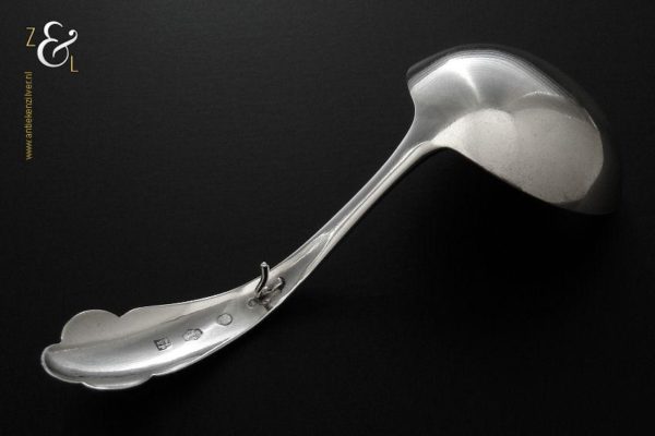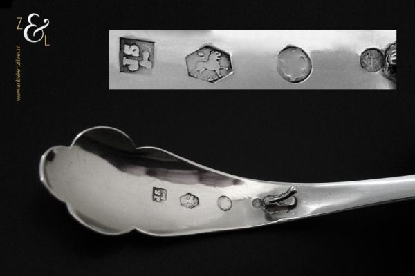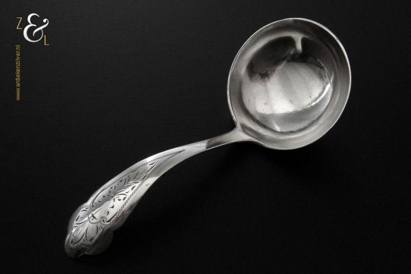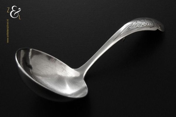 Deze roomlepel is gemaakt in Sneek Friesland door Johannes Henricus Schijfsma (meesterteken JS boven hamer in vierkant) in het jaar 1907 (jaarletter X). De zilveren Art Deco roomlepel met haak heeft een gegraveerd handvat weegt 26 gram en is 13.6 cm lang. De lepelbak heeft een diameter van 5.2 cm. De roomlepel heeft gebruikssporen (lichte krasjes in de lepelbak).