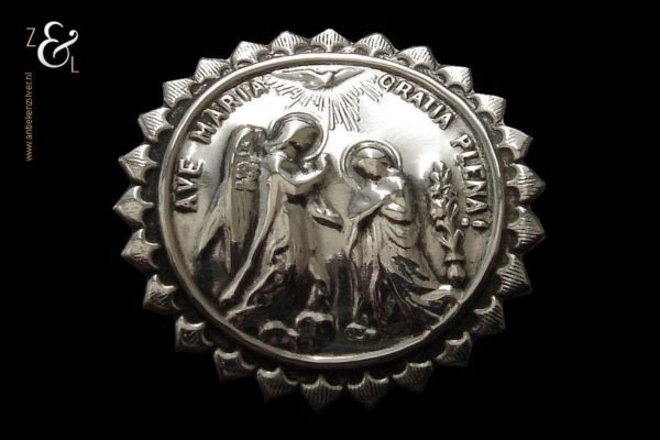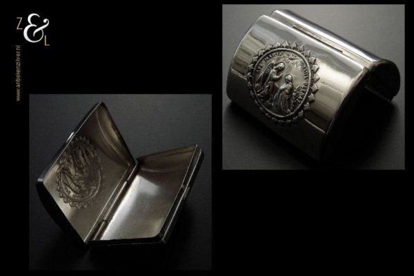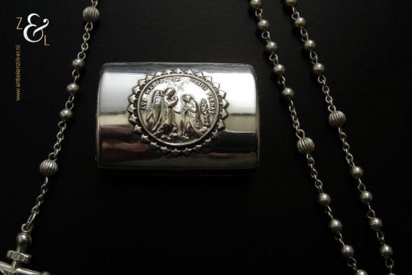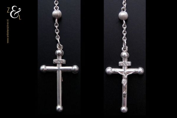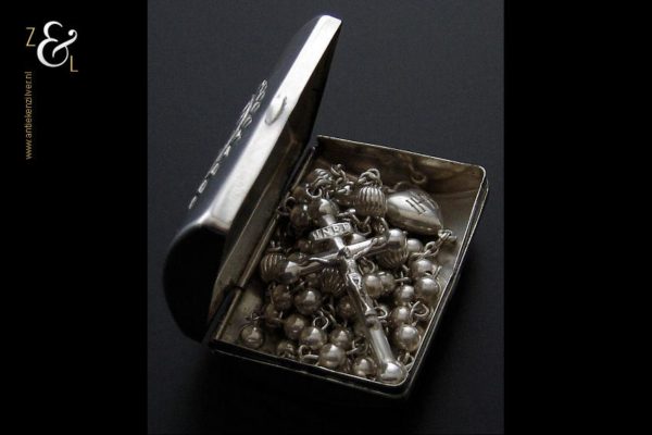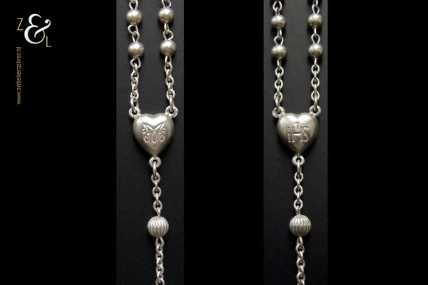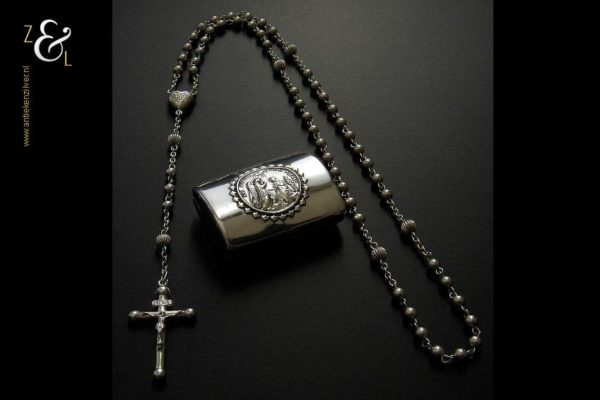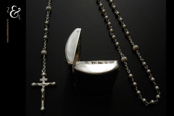 Deze rozenkrans of paternoster in doosje is gemaakt in Sittard / Heerlen door J.H.P. Vroemen (meesterteken PV.) tussen 1911 en 1958 dit zijn de jaren waarin de zilversmid J.H.P. Vroemen werkzaam was. De zilveren rozenkrans of paternoster is gemerkt in het oogje van het kruisje met 835 en het zilveren doosje is gemerkt met ZII 835 dat staat voor 2e gehalte zilver. Het kruisje met crucifix heeft een schildje met INRI wat Jezus van Nazareth koning der joden betekent. Op de hartvormige kraal staat aan de ene kant het monogram IHS wat Jezus redder der mensen betekent en aan de andere kant een gestileerde M. Op het doosje staat Ave Maria Gratia Plena wat Wees gegroet Maria vol van genade betekent. De rozenkrans of paternoster is 37.5 cm lang en het doosje is 4 cm lang 3 cm breed en 1.5 cm hoog samen wegen zij 25 gram.