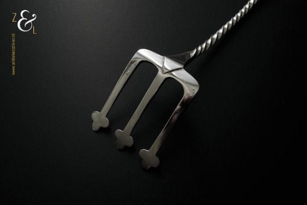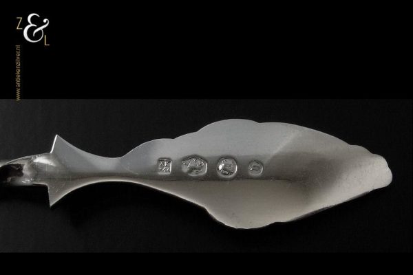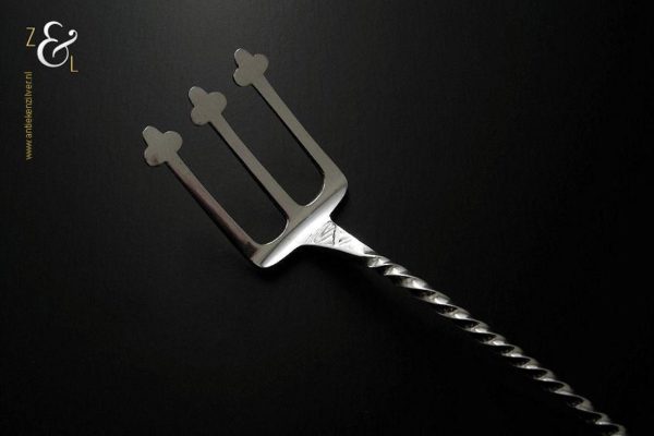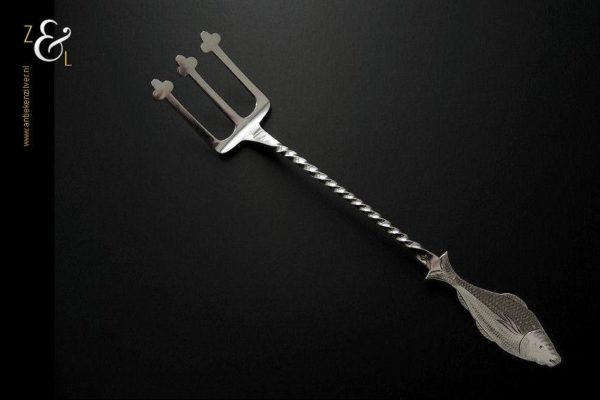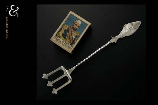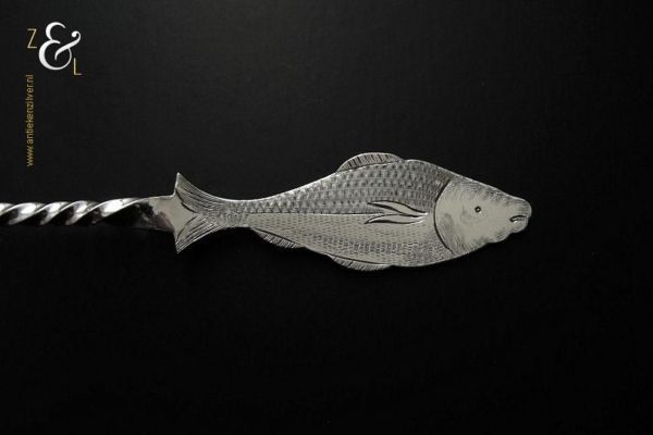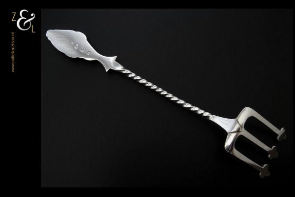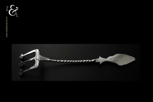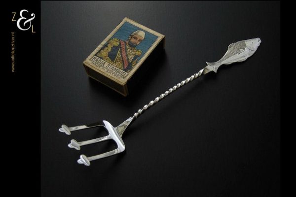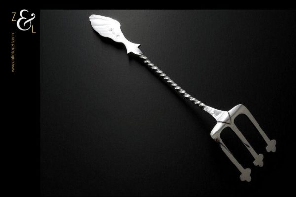 Deze sardienvork / sardinevork is gemaakt in Schoonhoven door Adrianus Kuijlenburg (meesterteken AK boven * 47 in vierkant) in het jaar 1883 (jaarletter Y). De zilveren vork heeft een getordeerde steel en een gegraveerde vis als handvat. De vork weegt 21 gram en is 16.9 cm lang.