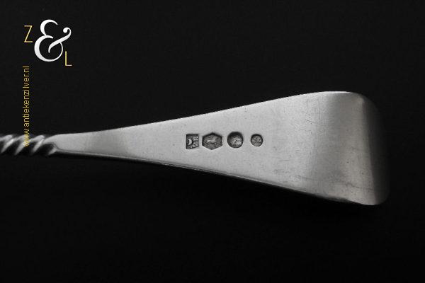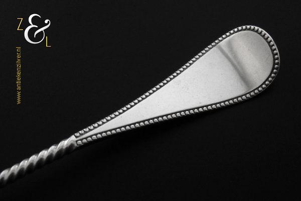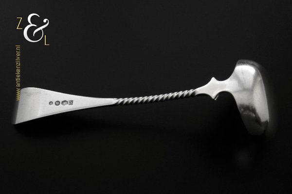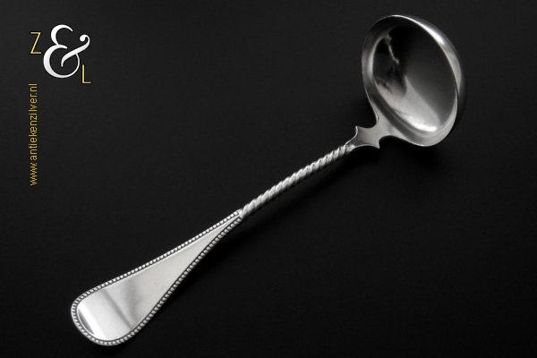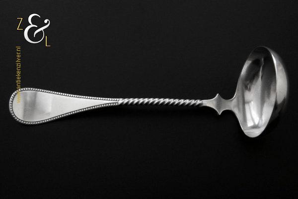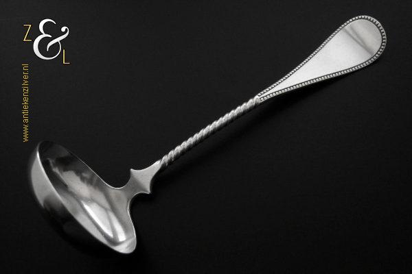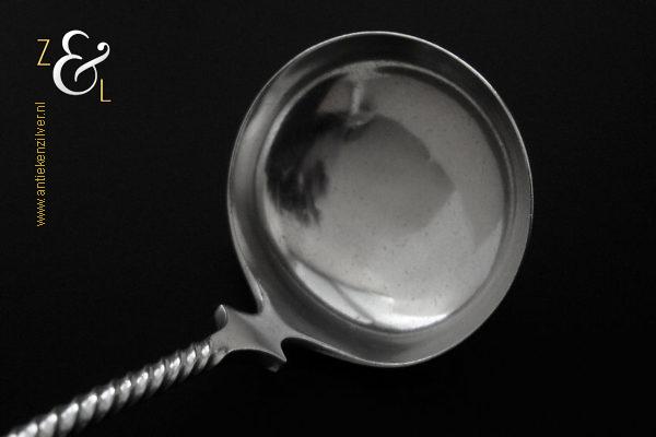 Sauslepel gemaakt in Voorschoten door de Firma J.M. van Kempen & Zonen (meesterteken liggend maantje tussen punten boven VK in vierkant) in het jaar 1899 (jaarletter P). De zilveren Neostijl sauslepel die een getordeerde steel heeft is uitgevoerd met een handvat in model parelrand. De sauslepel weegt 49 gram en is 17 cm lang. De lepelbak heeft een diameter van 5.2 cm. De sauslepel heeft gebruikssporen.
