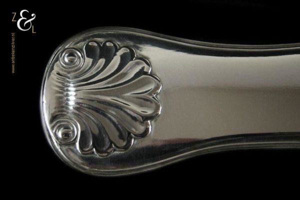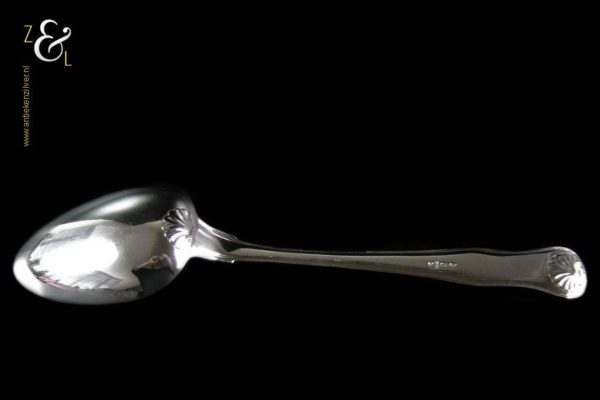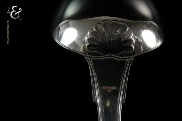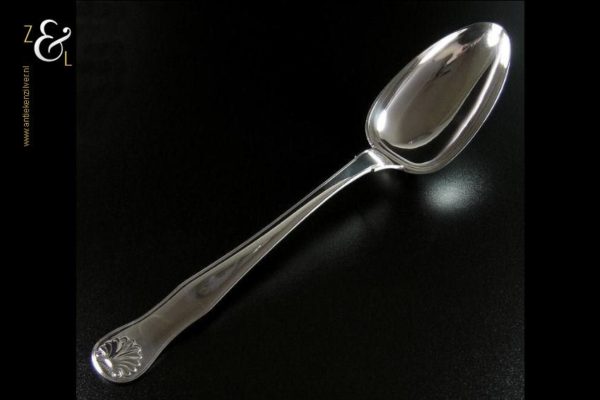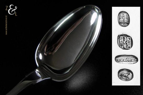 Deze brij- dienlepel is gemaakt in Kopenhagen Denemarken door Schröder (meesterteken Schröder in lang ovaal) in het jaar 1842. Deze hele grote (wij zijn nog nooit een grotere tegengekomen) zilveren brij / dienlepel heeft prachtige gestileerde schelpmotieven op de steel en aan de achterzijde van de bak. De lepel is tevens uitgevoerd met het zilverkeur drie torens met daaronder het getal 42 duidend op het jaartal 1842 dit is het jaar waarin het stuk gemaakt is, het essayeurs stempel PRH in een cirkel dat staat voor Peter Reimer Hinnerup die van 1840 tot 1863 werkzaam was als essayeur te Kopenhagen en een stempel met een ram? (hiervan weten wij de betekenis niet). De lepel weegt 257 gram en is 37.6 cm lang de bak meet 13.8 cm x 8.3 cm.