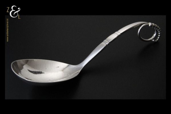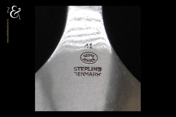 Deze grote op de hand gedreven design dienlepel uitgevoerd in model 41 is ontworpen door Georg Jensen en gemaakt in Kopenhagen Denemarken bij de wereldberoemde zilversmederij van Georg Jensen (meesterteken GEORG JENSEN in gestippeld ovaal) dat gebruikt werd van 1945 tot heden. Tevens is deze dienlepel gekeurd met STERLING DENMARK een aanduiding voor eerste gehalte zilver. De zilveren dienlepel weegt 72 gram en is 18.3 cm lang. De lepelbak is 7.5 cm lang bij 5.1 cm breed.