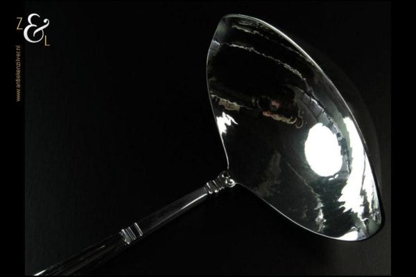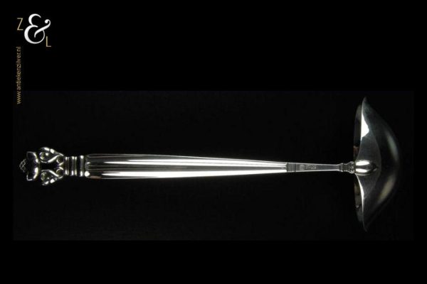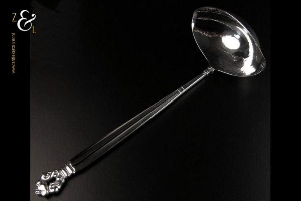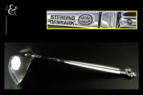 Deze sauslepel (uitgevoerd in het Acorn model ontworpen door Johan Rohde in 1915) is gemaakt in Kopenhagen Denemarken bij de wereldberoemde zilversmederij van Georg Jensen (meesterteken GEORG JENSEN in gestippeld ovaal) dit meesterteken was in gebruik na 1945. Tevens is deze vork gekeurd met STERLING DENMARK een aanduiding voor eerste gehalte zilver. De zilveren sauslepel is 20 cm lang, de bak meet 7.5 cm bij 5 cm en weegt 84 gram.