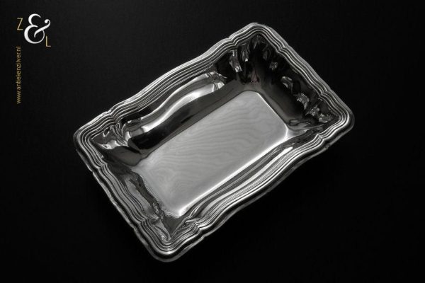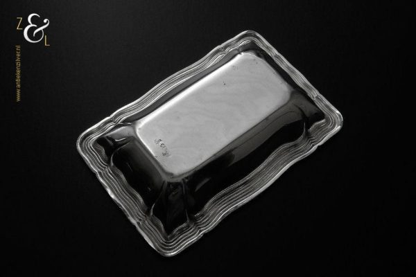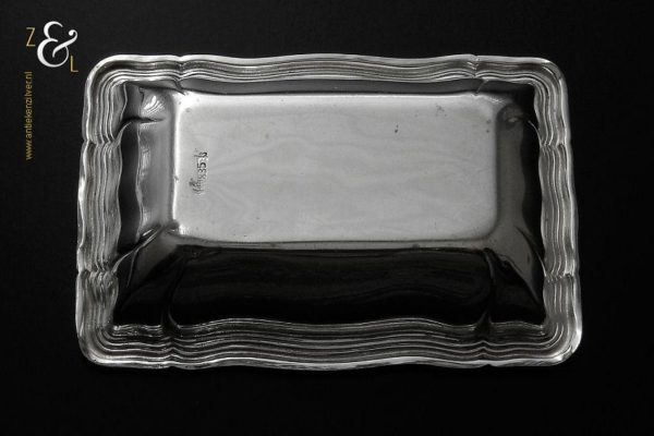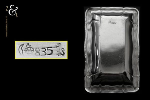 Dit schaaltje is gemaakt in Duitsland en draagt de zilverkeuren: halve maan (Duits symbool voor zilver), kroon (Duits productiesymbool), 835 (Fijnheid van het zilver 835/1000) en steigerend paard of leeuw (Meesterteken). Het rechthoekige zilveren schaaltje weegt 28 gram is 9.3 cm lang 6.2 cm breed en 1.5 cm hoog.