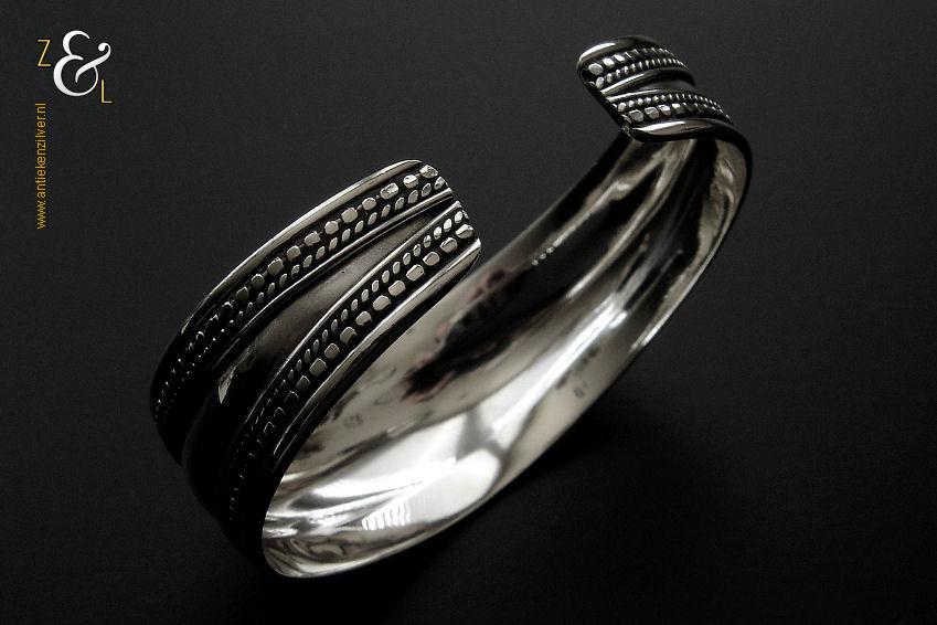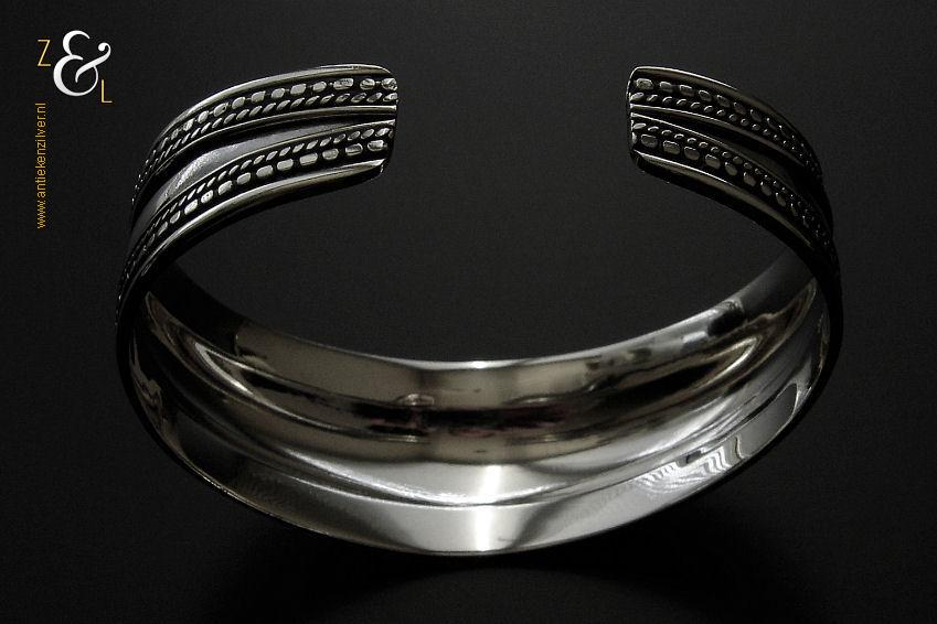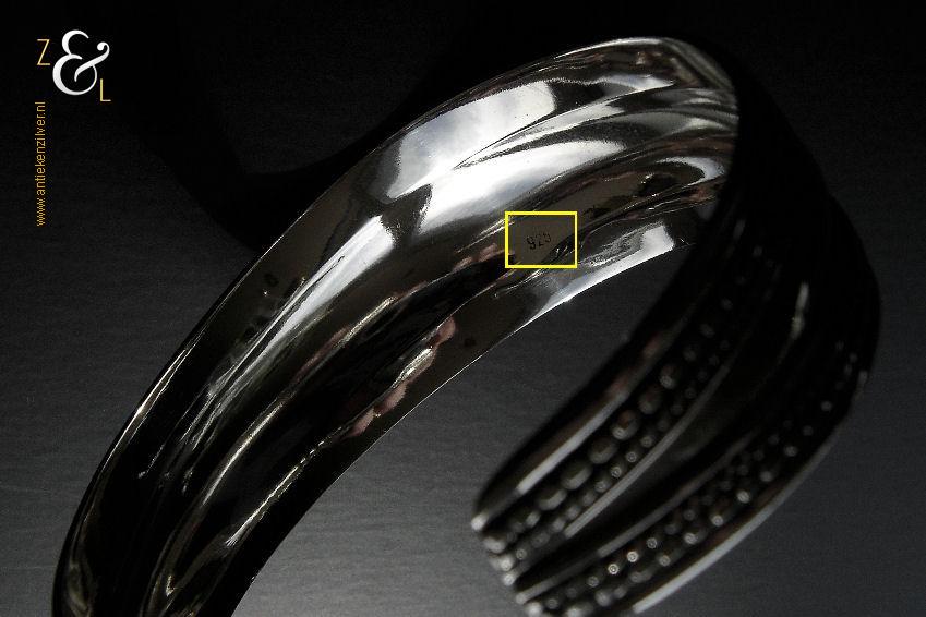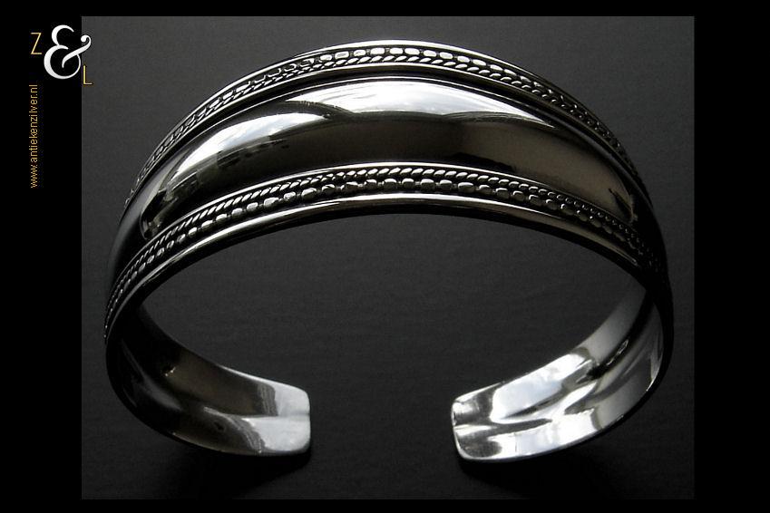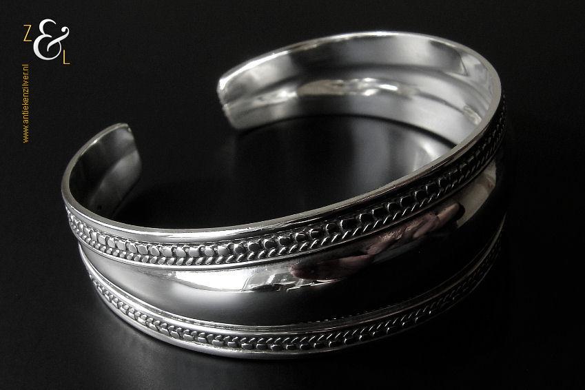 Deze massief zilveren armband is in het buitenland gemaakt (vermoedelijk Engeland) en stamt uit de zeventiger jaren. De armband is gekeurd met het zilverkeur 925 voor eerste gehalte (Sterling) zilver heeft een diameter van 6 cm is 2.3 cm breed en weegt 27 gram.