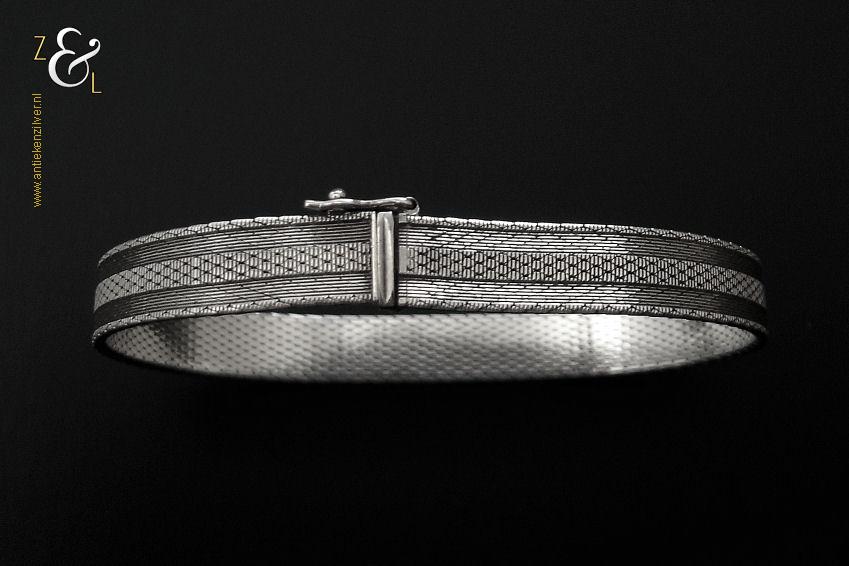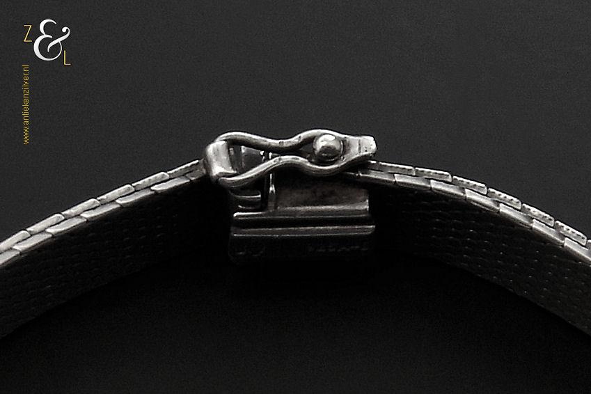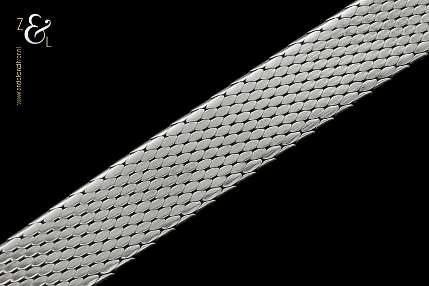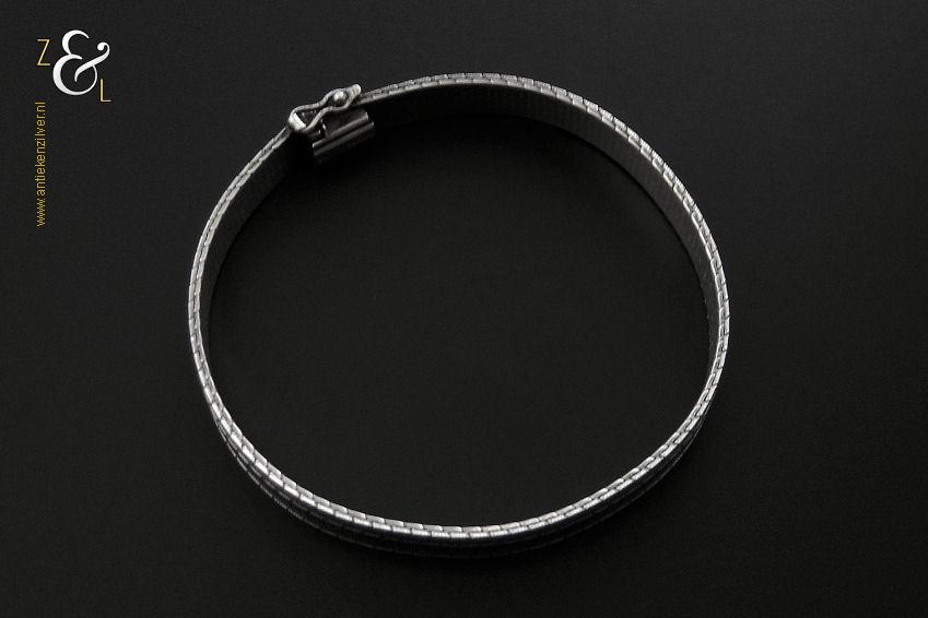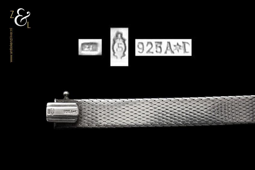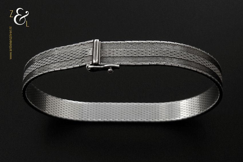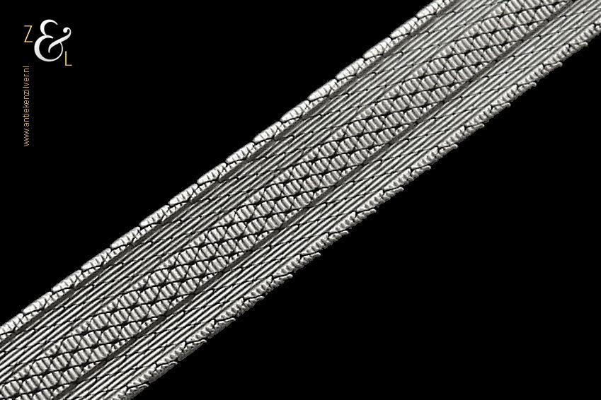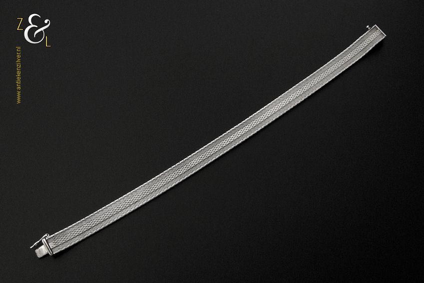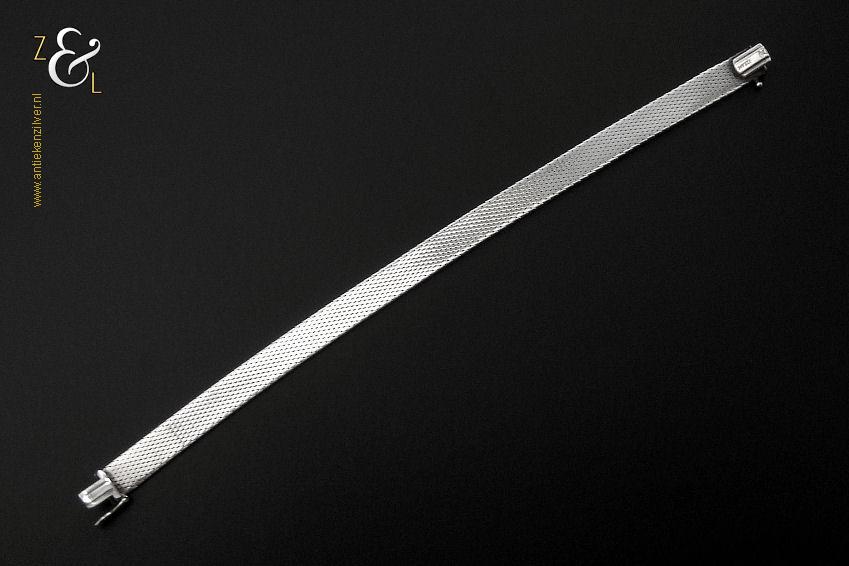 Deze platte gevlochten armband is gemaakt in Pforzheim Duitsland bij de zilversmederij van Andreas Daub (meesterteken A*D / A sterretje D) in de zestiger / zeventiger jaren. De massief zilveren armband met veiligheidsslot draagt het zilverkeur 925 wat staat voor eerste gehalte zilver. Tevens is de armband in Nederland gekeurd met het zilverkeur ZI voor eerste gehalte zilver en het merk voor aanhangsels dit is het merk voor werken van goud of zilver met aanhangsels gebruikt van 1905 tot heden. De armband weegt 21 gram en is 18.6 cm lang bij 0.8 cm breed.