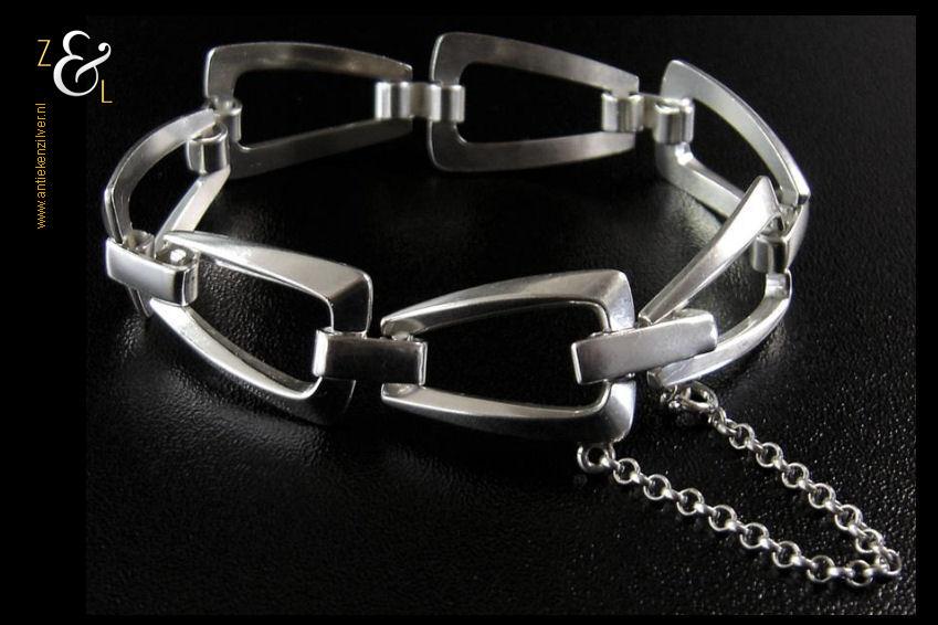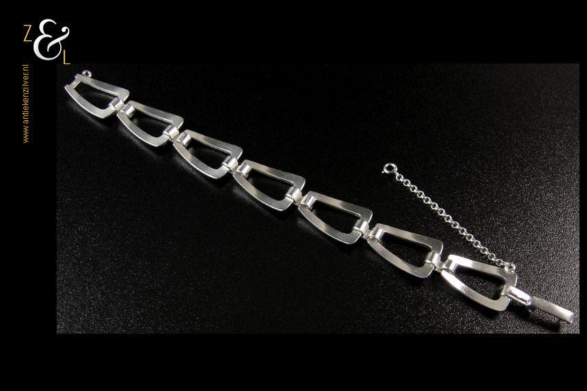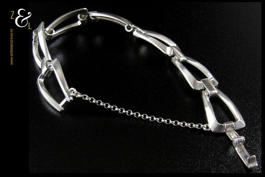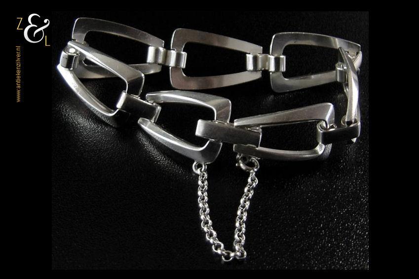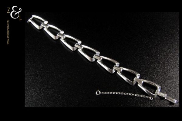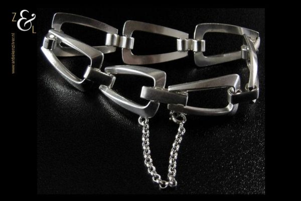 Deze massief zilveren schakelarmband is gemaakt in Nederland in de zeventiger jaren. De armband is uitgevoerd met een veiligheidskettinkje het draagt het zilverkeur 835 voor 2e gehalte zilver is 18.2 cm lang 2.5 cm breed en weegt 27 gram.