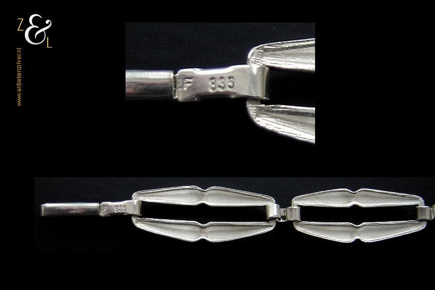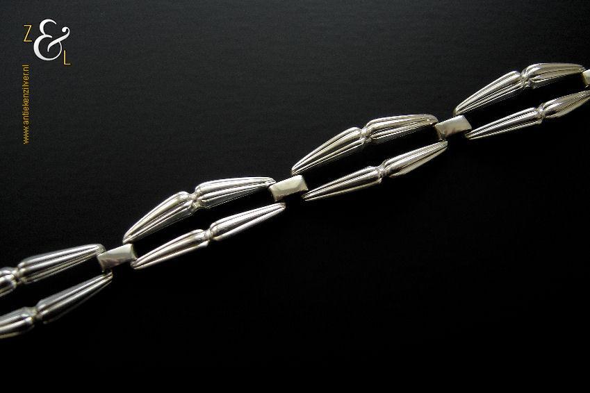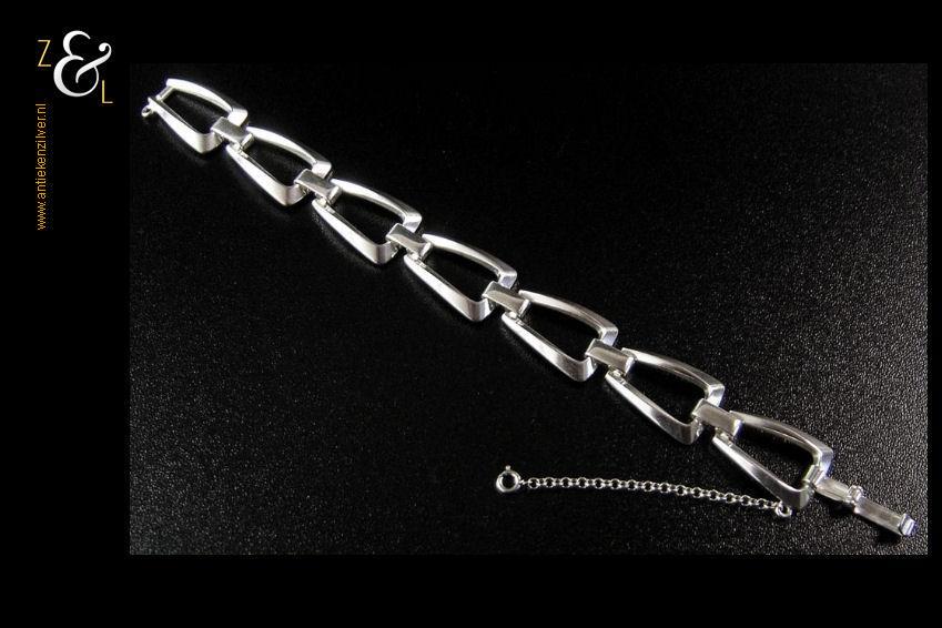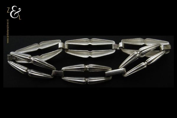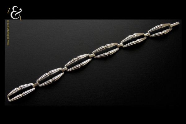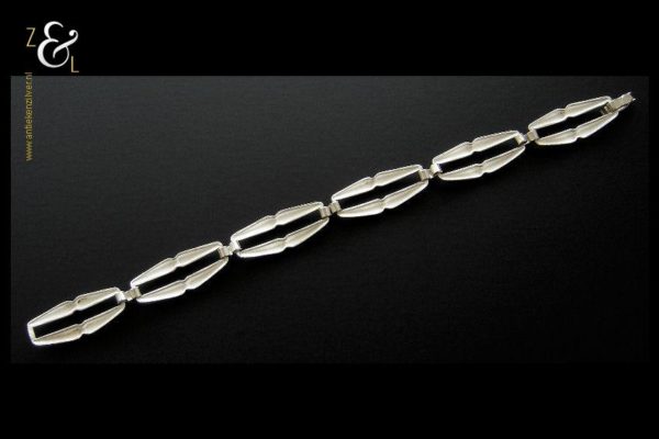 Deze massief zilveren schakelarmband is gemaakt in Nederland in de zeventiger jaren. De armband draagt het zilverkeur 835 voor 2e gehalte zilver is 19 cm lang 1.1 cm breed en weegt 18 gram.