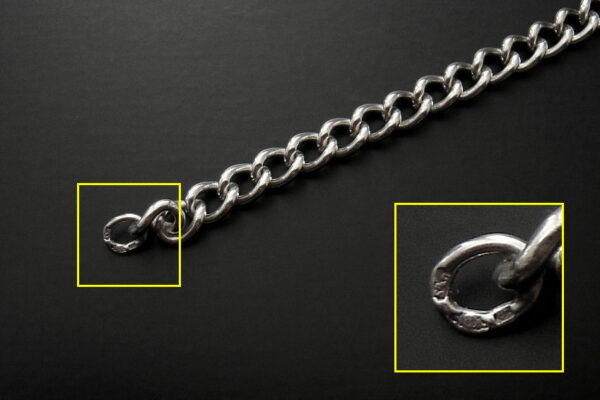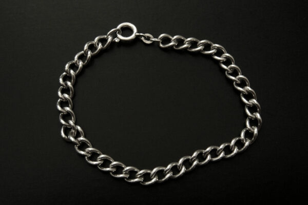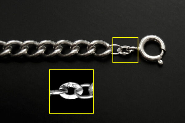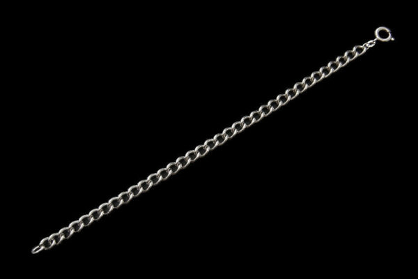 Deze zilveren schakelarmband met gourmetschakel is gemaakt in Nederland en stamt uit de zestiger- zeventiger jaren. De schakelarmband is gekeurd bij het slotje met het gehaltemerk 835 dit staat voor tweede gehalte zilver 835/1000. Tevens is de schakelarmband aan de andere zijde op het oog gemerkt met een niet goed leesbaar meesterteken, het Nederlandse gehaltemerk ZII (tweede gehalte zilver) voor voorwerpen in voltooide staat aangeboden en het merk voor aanhangsels, dit is het merk voor werken van goud of zilver met aanhangsels, zogenaamd kettingwerk. De schakelarmband weegt 13 gram en is 20 cm lang. Deze schakelarmband is ook goed te gebruiken als bedelarmband.