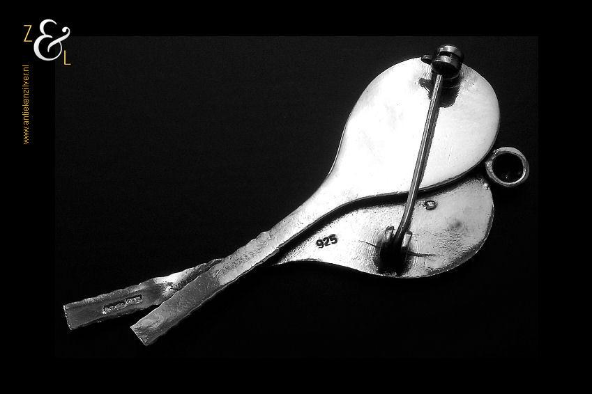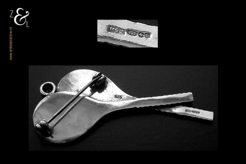 Deze broche met twee gekruiste tennisrackets plus bal is in de zeventiger jaren gemaakt en stamt vermoedelijk uit Engeland (meesterteken MGL in rechthoek). De zilveren broche die voorzien is van een afsluitbare speld is gekeurd met het zilverkeur 925 voor eerste gehalte (Sterling) zilver, weegt 9 gram en is 5.5 cm lang 2.5 cm breed.
