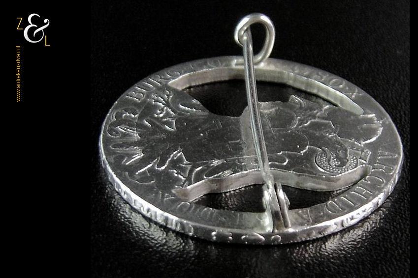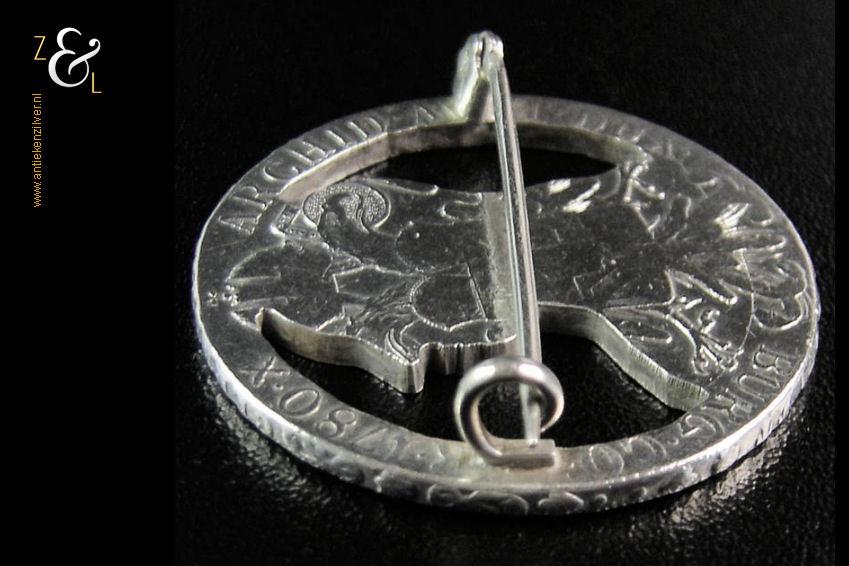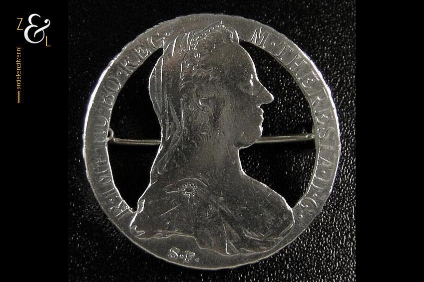Deze zilveren muntbroche is gemaakt van een Maria Theresia Thaler dit is een Oostenrijkse munt die in het Habsburgse Rijk geslagen werd en ter nagedachtenis aan het sterftejaar van de Habsburgse keizerin al eeuwenlang het jaartal 1780 draagt.