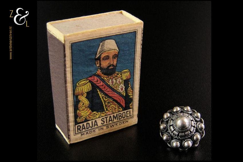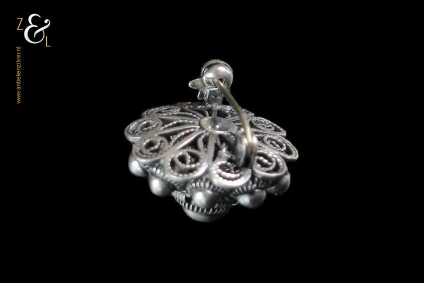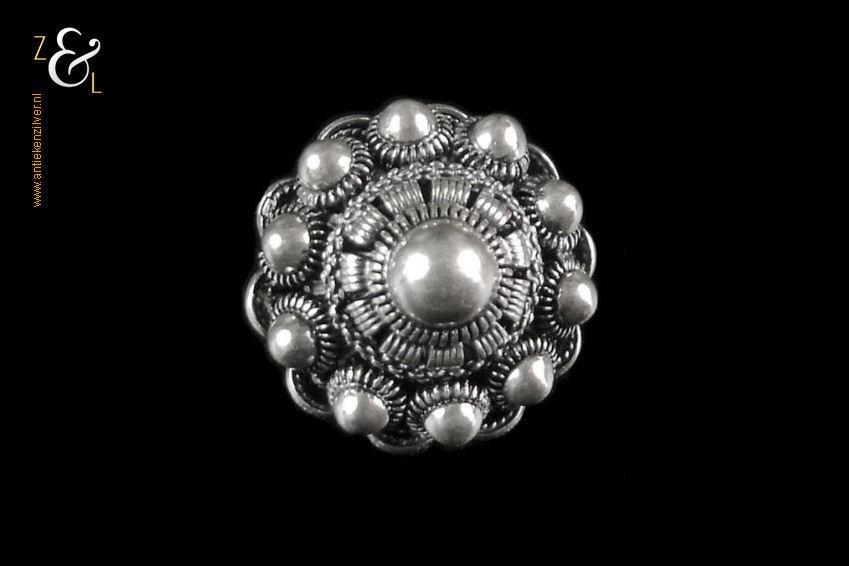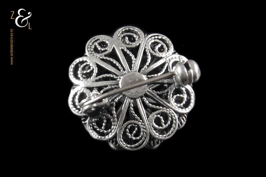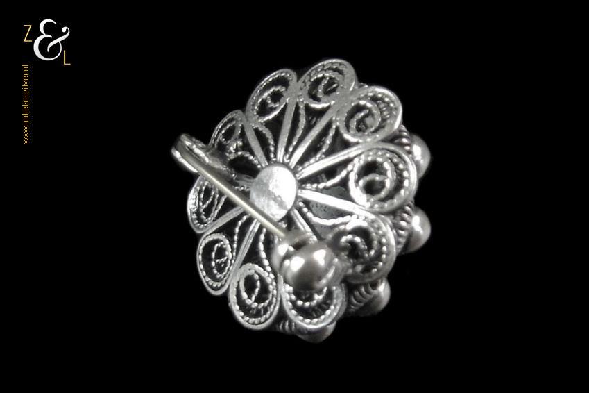 Dit bolle Zeeuwse knopje is zowel aan de voor als achterzijde prachtig uitgevoerd (in opengewerkt filigrain*) en voorzien van een afsluitbare speld. De broche heeft een diameter van 2 cm en weegt 6 gram. De broche is getoetst* en bestaat uit 2e gehalte zilver.
