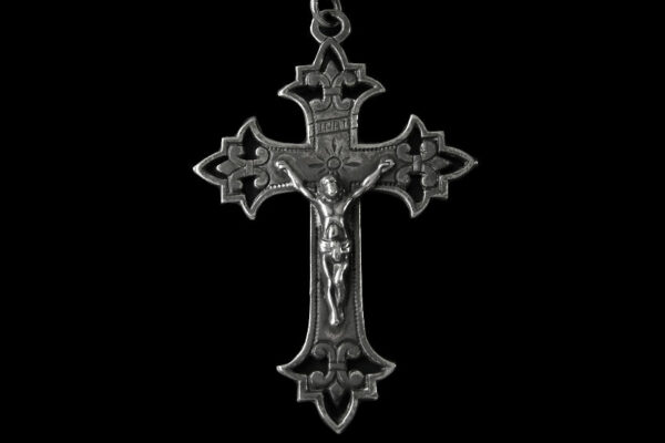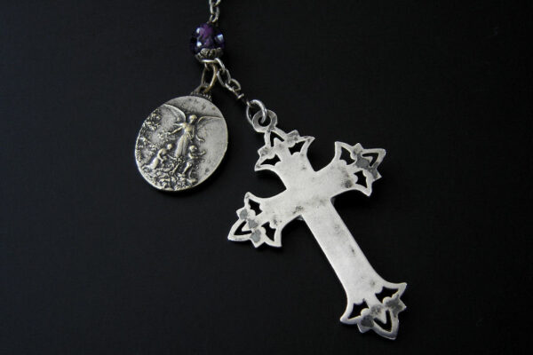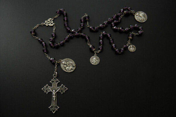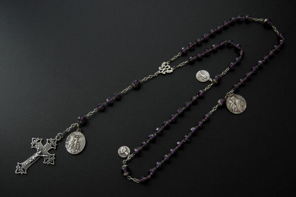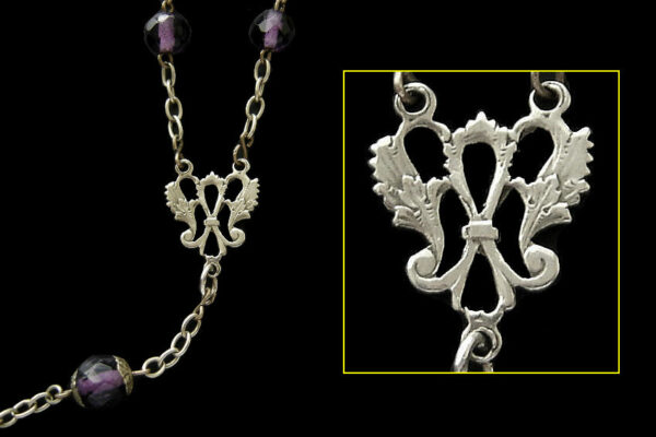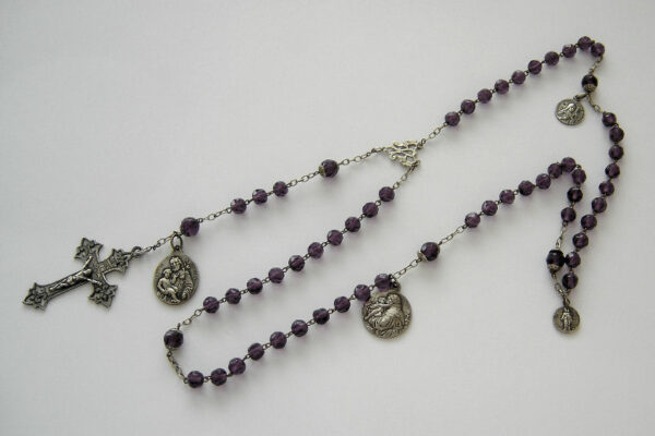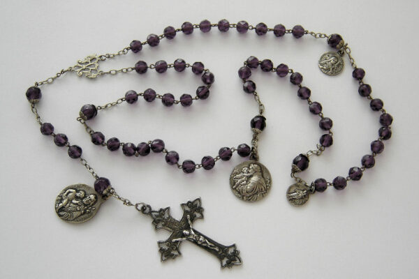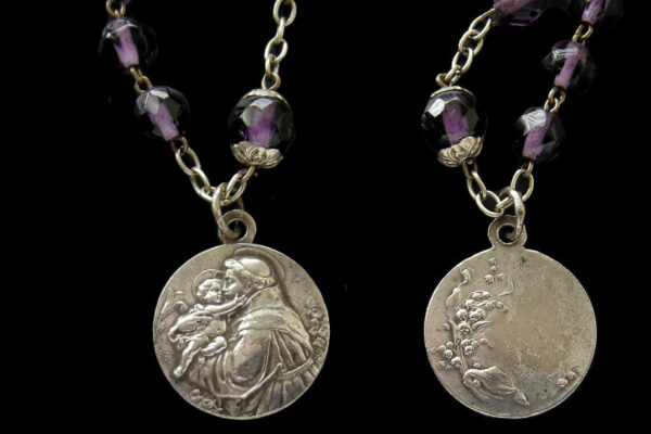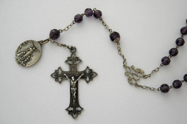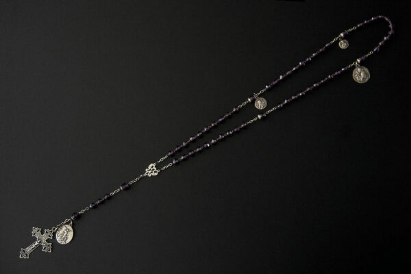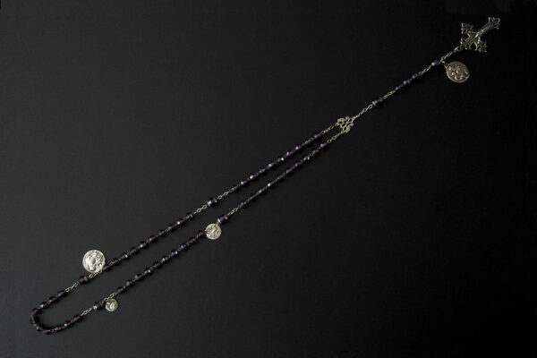 Deze antieke rozenkrans of paternoster met gefacetteerde amethist gebedskralen is omstreeks 1900 (eind 19e begin 20e eeuw) gemaakt in Frankrijk. Het zilveren ajour gegoten crucifix heeft een gegraveerd bordje met INRI boven het hoofd van Christus en is aan de vier uiteinden van het kruis gedecoreerd met een Franse lelie. Tevens heeft de rozenkrans of paternoster een verbindingsstuk met een gestileerde M dat staat voor het Onbevlekt Hart van Maria en heeft vier (zilveren / verzilverde) medailles. De rozenkrans of paternoster is 50 cm lang en weegt 44 gram. Het crucifix meet 5 cm bij 3.2 cm. De rozenkrans of paternoster heeft gebruikssporen en is bewust niet gepoetst om de oude patina te behouden.