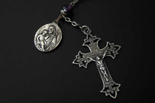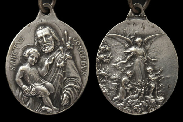 De eerste medaille bij het crucifix heeft aan een zijde de afbeelding van Sint-Josef met het kind Jezus en de tekst “Sanctus Josephus”. De andere zijde heeft de afbeelding van een aartsengel met twee kinderen. De ovale medaille meet 2.2 cm bij 1.5 cm.