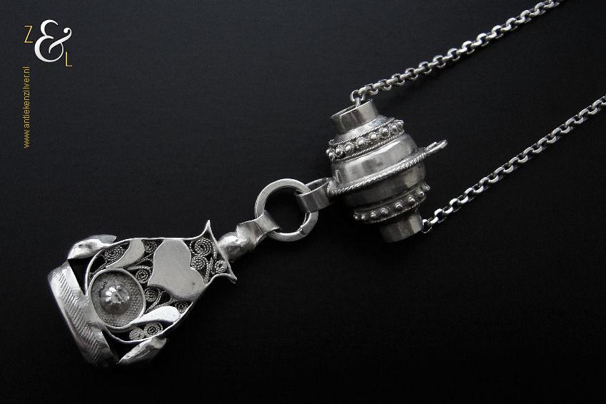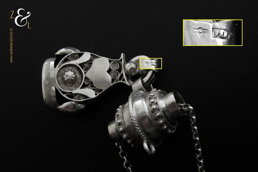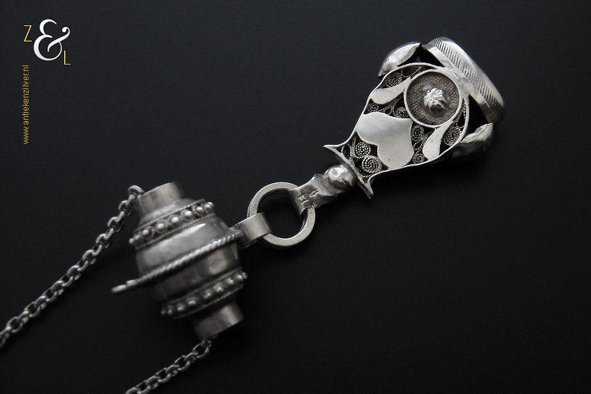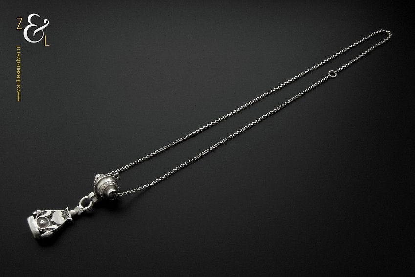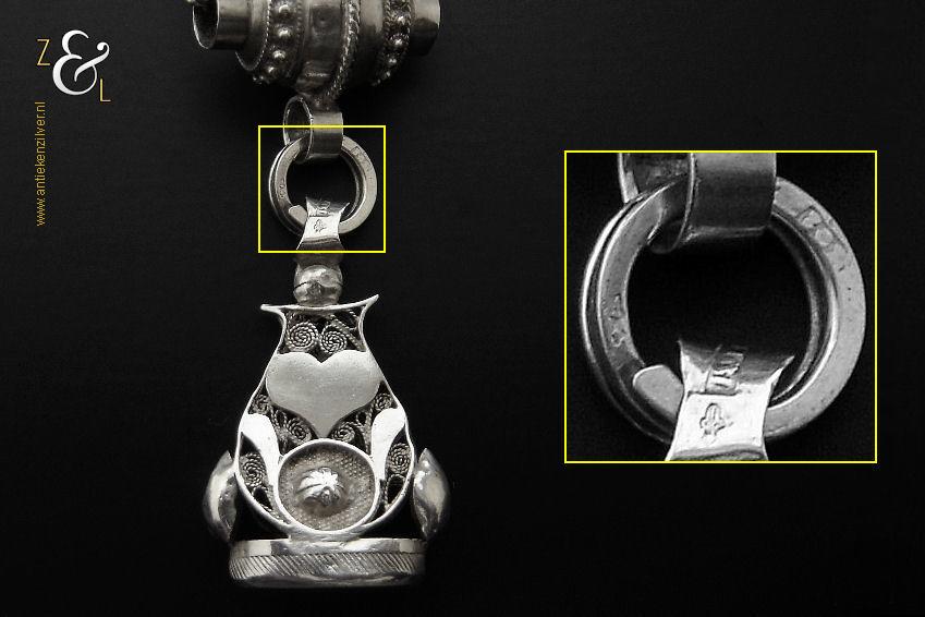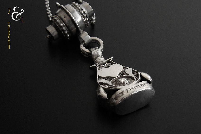 Deze zilveren signettenketting / chatelaine / horlogeketting is gemaakt in Nederland en stamt uit de eerste helft van de 20e eeuw. De ketting heeft een bijzonder mooi uitgevoerde tonvormige schuif met parelrand en het signet is fijntjes uitgevoerd in opengewerkt filigrain* met daarop een uitgezaagd en vastgesoldeerd hart. Van de signettenketting / chatelaine / horlogeketting draagt het signet een niet goed leesbaar meesterteken en het zilverkeur zwaardje (dit is het gehaltemerk voor kleine zilveren werken) dat tussen 1906 en 1953 in gebruik was. De tonvormige schuif is tevens gekeurd met het het zilverkeur zwaardje en met het merk voor aanhangsels dit is het merk voor werken van goud of zilver met aanhangsels gebruikt van 1905 tot heden. De signettenketting / chatelaine / horlogeketting is in totaal 39 cm lang. Het signet is 4.2 cm hoog, 1.1 cm breed bij 2.6 cm lang en heeft lichte gebruikssporen.