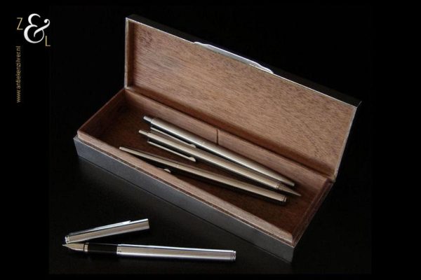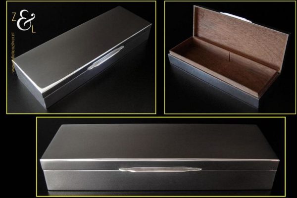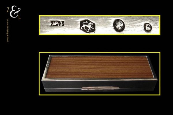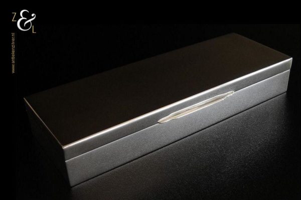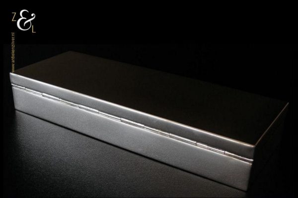 Presenteerdoos gemaakt in Haarlem door de Firma A. Presburg & Zoon (meesterteken APz3 in zeskantige rechthoek) in het jaar 1950 (jaarletter P). De zware in hoogglans uitgevoerde rechthoekige zilveren doos die aan de binnenzijde bekleed is met cederhout weegt 328 gram is 19.2 cm lang 6.7 cm breed en 3.2 cm hoog. De doos die bedoeld is voor het presenteren van sigaretten is ook goed te gebruiken als lepeldoos, juwelendoos, pennendoos enzovoorts.