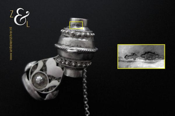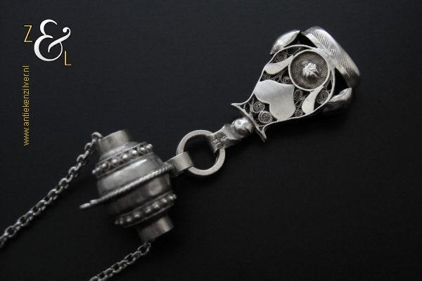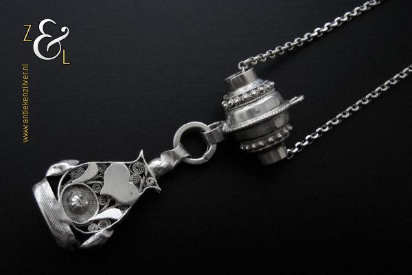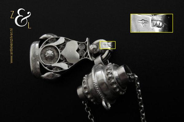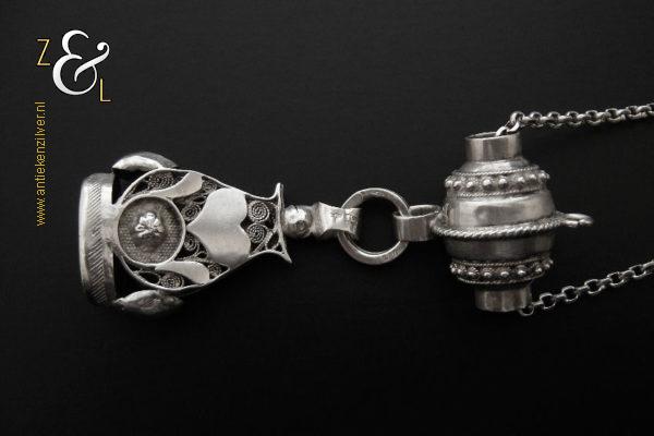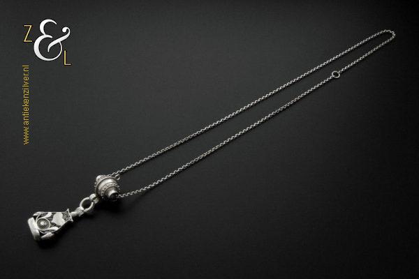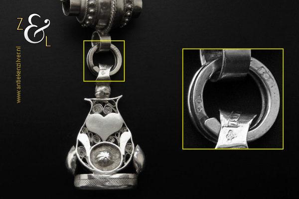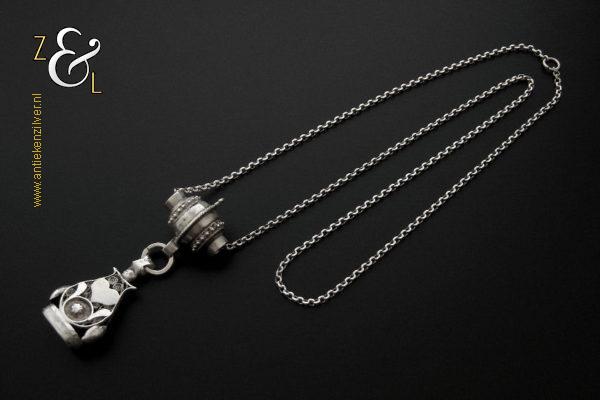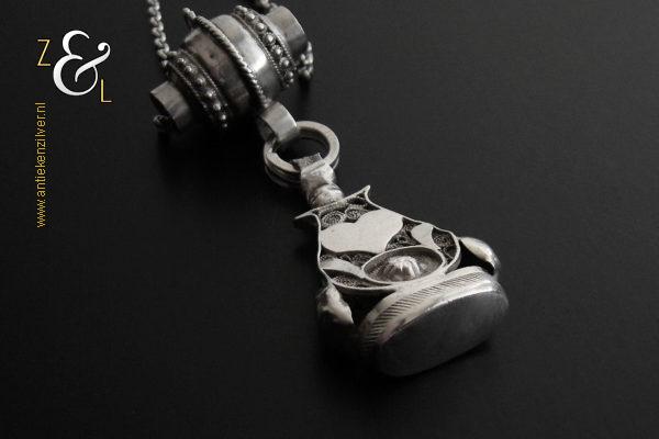 Deze zilveren signettenketting / chatelaine / horlogeketting is gemaakt in Nederland en stamt uit de eerste helft van de 20e eeuw. De ketting heeft een bijzonder mooi uitgevoerde tonvormige schuif met parelrand en het signet is fijntjes uitgevoerd in opengewerkt filigrain* met daarop een uitgezaagd en vastgesoldeerd hart. Van de signettenketting / chatelaine / horlogeketting draagt het signet een niet goed leesbaar meesterteken en het zilverkeur zwaardje (dit is het gehaltemerk voor kleine zilveren werken) dat tussen 1906 en 1953 in gebruik was. De tonvormige schuif is tevens gekeurd met het het zilverkeur zwaardje en met het merk voor aanhangsels dit is het merk voor werken van goud of zilver met aanhangsels gebruikt van 1905 tot heden. De signettenketting / chatelaine / horlogeketting is in totaal 39 cm lang. Het signet is 4.2 cm hoog, 1.1 cm breed bij 2.6 cm lang en heeft lichte gebruikssporen.