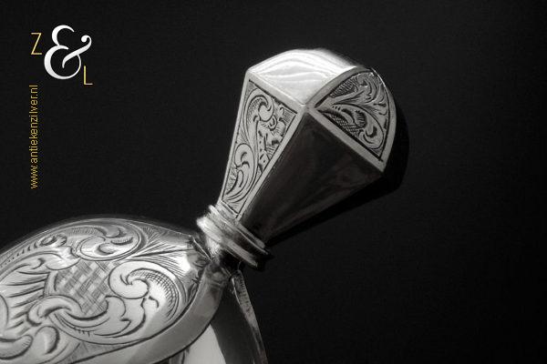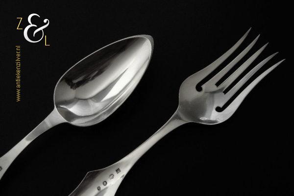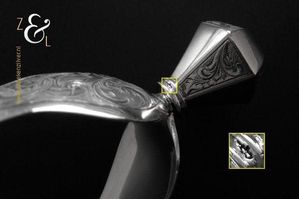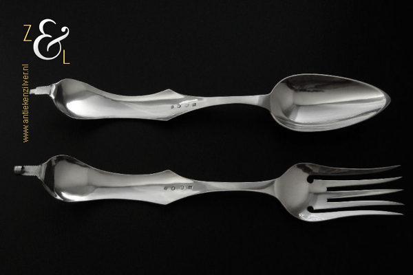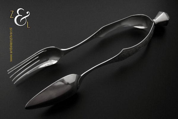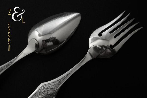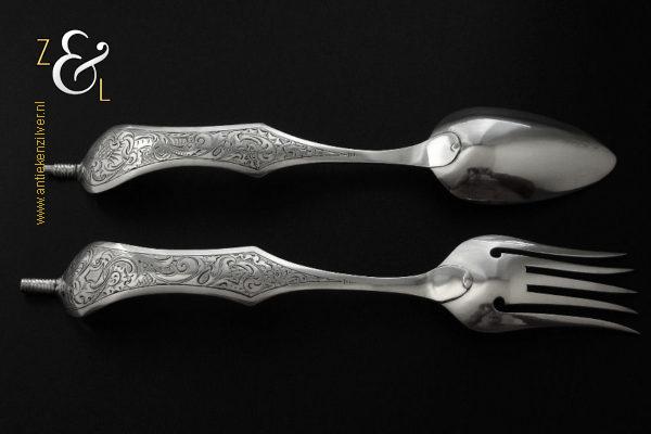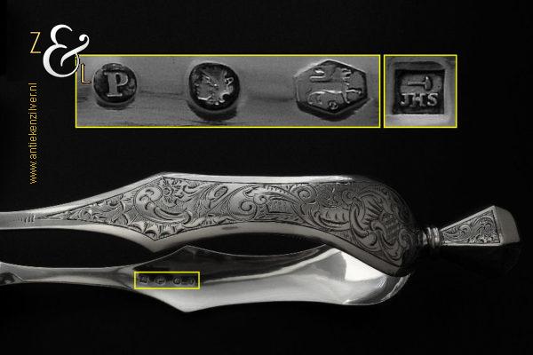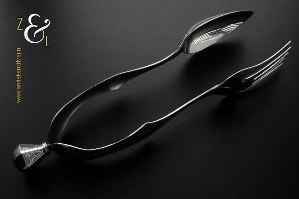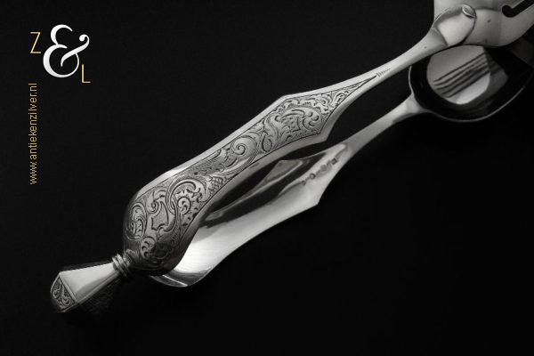 Sladientang / saladetang / slatang gemaakt in Amsterdam door Jacob Hendrik Schouten (meesterteken hamer boven JHS in vierkant) in het jaar 1849 (jaarletter P). De knop is gekeurd met het zilverkeur zwaardje (dit is het gehaltemerk voor kleine zilveren werken). De zilveren sladientang / saladetang / slatang heeft een aparte zeshoekige schroefknop en is uitneembaar tot twee afzonderlijke delen. De sladientang / saladetang / slatang die diep gegraveerd is met c-vormige voluten weegt 156 gram en is 28.6 cm lang.