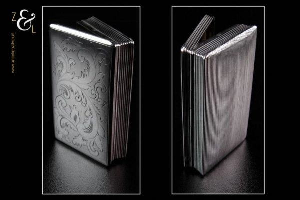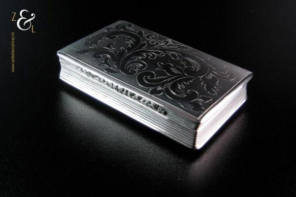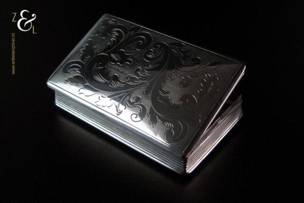 Snuifdoos gemaakt in Schoonhoven door Abraham Kruijt (meesterteken AK boven 22 in vierkant) in het jaar 1847 (jaarletter N). Abraham Kruijt was gespecialiseerd in het maken en graveren van doosjes. Van hem zijn ook lodderein- of reukdoosjes, brilledoosjes en tabaksdozen bekend. Deze prachtige zilveren biedermeier snuifdoos heeft een deksel verfraaid met graveerwerk van krullen en rocailles, aan de voorkant van het deksel is een uitstekend randje aangebracht om het openen te vergemakkelijken; dit noemen we een duimstuk, deze doos is uitgevoerd met een bijzondere mooi gevormd duimstuk, de zijkanten van de doos zijn geribd en de bodem heeft een lijnendecor in guillocheer techniek tevens zijn aan de binnenkant sporen van verguldsel te vinden, dit was om het zilver te beschermen tegen het aantasten van het snuiftabak. De doos weegt 60 gram is 8.2 cm lang 4.9 cm breed en 1.6 cm hoog. Er zit een kleine beschadiging op een hoek van het deksel zie inzet foto 4.