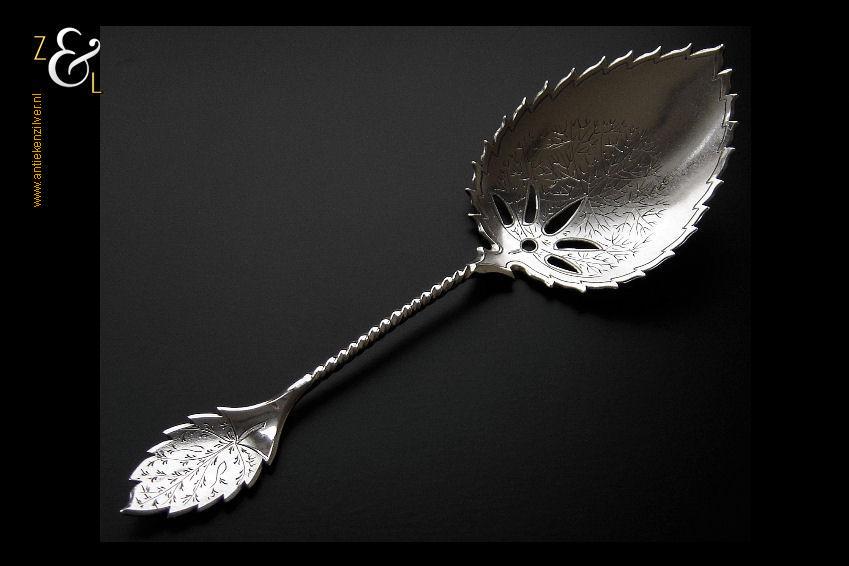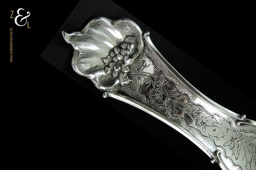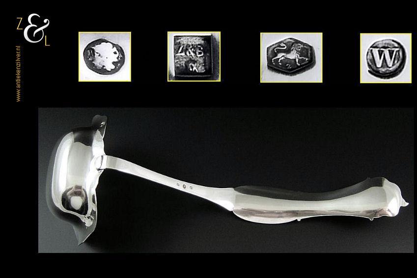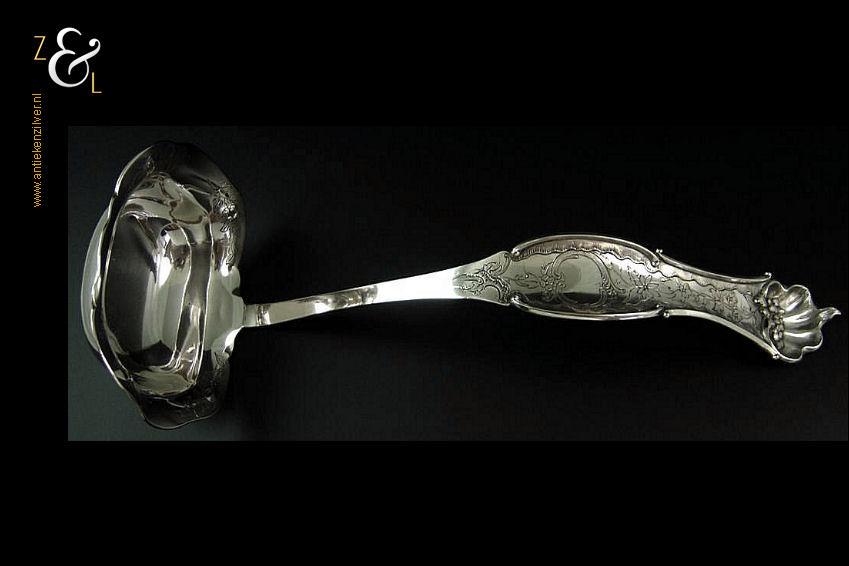 Soepdienlepel gemaakt in Rotterdam door Pieter Zöllner & Willem Nicolaas Beijder (meesterteken Z&B boven XX in vierkant) in het jaar 1856 (jaarletter W). De zilveren Biedermeier soepdienlepel heeft een gegoten steel en gedreven lepelbak die voorzien is van gegraveerde bloemmotieven, rocailles, c-vormige voluten en drie hoog gedreven verschillende soorten bloemen op een gegranuleerde ondergrond. De soepdienlepel weegt 235 gram en is 34 cm lang. De lepelbak is 12.4 cm lang bij 10 cm breed.