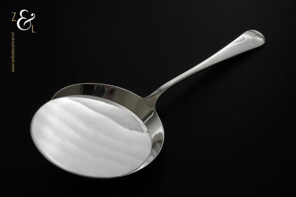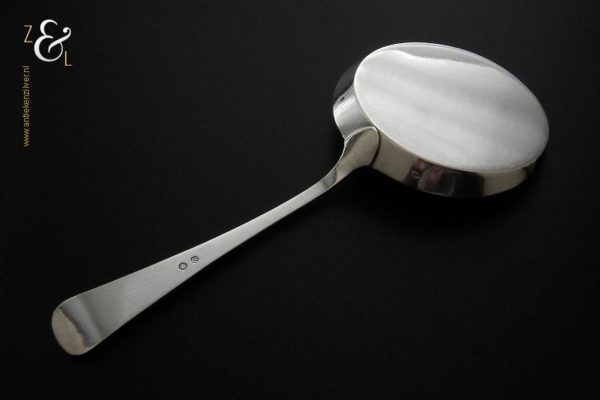 Deze spiegeleischep is gemaakt in Voorschoten door de Zilverfabriek Voorschoten N.V. (meesterteken V boven liggend maantje in achthoek) in het jaar 1931 (jaarletter W). De in model Haags lof uitgevoerde zilveren spiegeleischep weegt 95 gram en is 23 cm lang. Het schepgedeelte heeft een diameter van 9.5 cm.