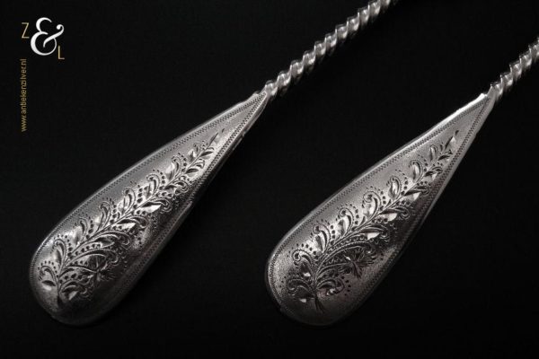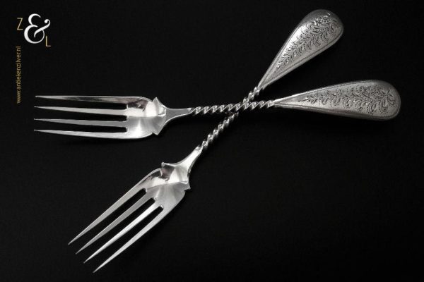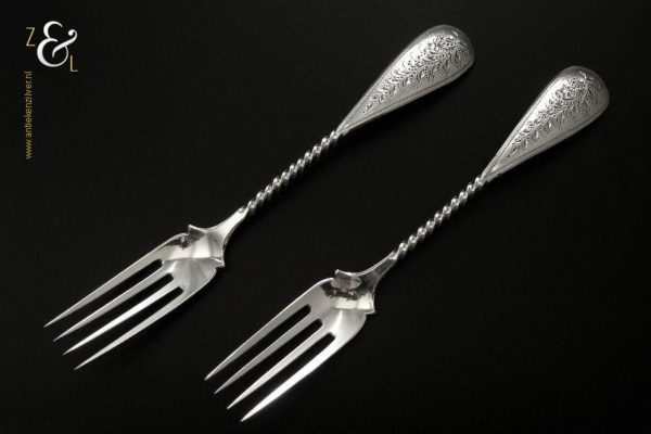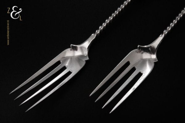 Dit stel belegvorken / stel zuurvorken is gemaakt in Schoonhoven door Pieter Coenraad Burghoorn (meesterteken PC boven B ster in vierkant) in het jaar 1889 (jaarletter E). De zilveren Biedermeier belegvorken / zuurvorken hebben getordeerde stelen en gegraveerde en gematteerde handvatten (matteren is een bewerking waarbij de zilversmid het oppervlak van een zilveren voorwerp een matte structuur geeft). De elegante vorken die aan de achterzijde tevens fijntjes gegraveerd zijn wegen 42 gram en zijn 16 cm lang.