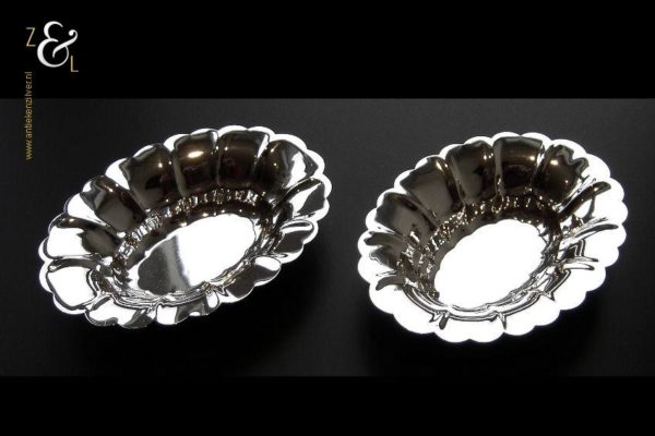 Stel bonbonmandjes / bonbonschaaltjes gemaakt in York Engeland (gekeurd met STERLING). Deze geschulpte sterling zilveren bonbonmandjes wegen samen 80 gram en zijn 10.6 cm lang 8 cm breed en 2 cm hoog. Ook goed te gebruiken als pepermuntmandje voor na het diner.