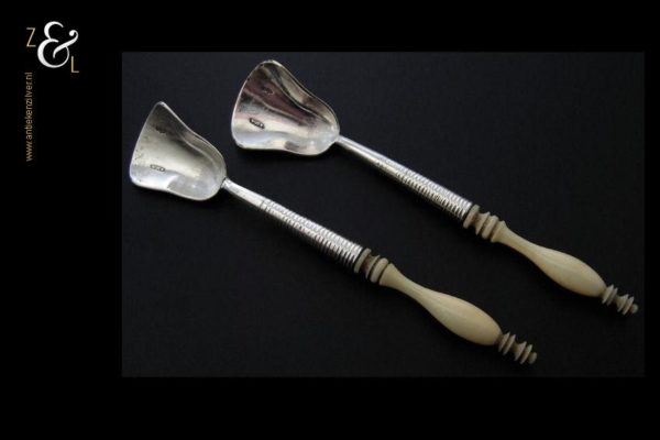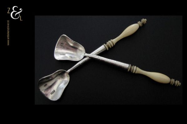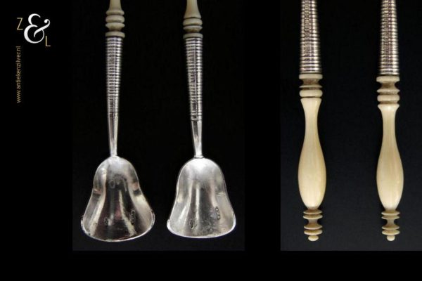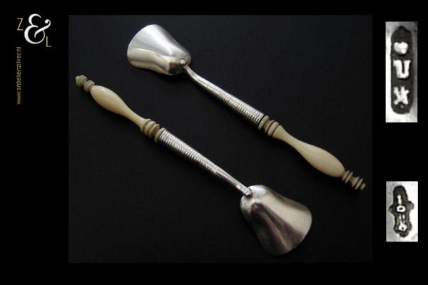 Dit stel specerijschepjes met gedraaide benen stelen zijn gemaakt in Amsterdam door Johan Christiaan Utrecht (meesterteken een hartje met daaronder een U en een sterretje in een zeshoek) tussen 1822 en 1845. De Hollands zilveren specerijschepjes wegen 11 gram zijn 9.1 cm lang en hebben een bakje van 1.8 cm breed.