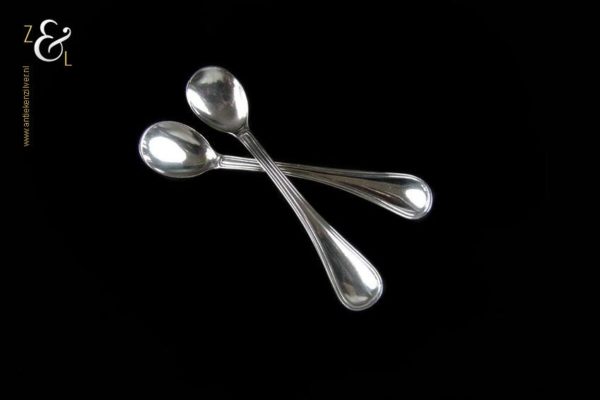 Dit stel zoutlepels / mosterdlepels is gemaakt in Voorschoten door de Firma J.M. van Kempen & Zonen (meesterteken VK liggend maantje in rechthoek) tussen 1906 en 1924 gekeurd met het zilverkeur zwaardje (dit is het gehaltemerk voor kleine zilveren werken) dat tussen 1906 en 1953 in gebruik was. De in dubbel rondfilet uitgevoerde zilveren zoutlepels / mosterdlepels wegen samen 14 gram en zijn 8.8 cm lang.